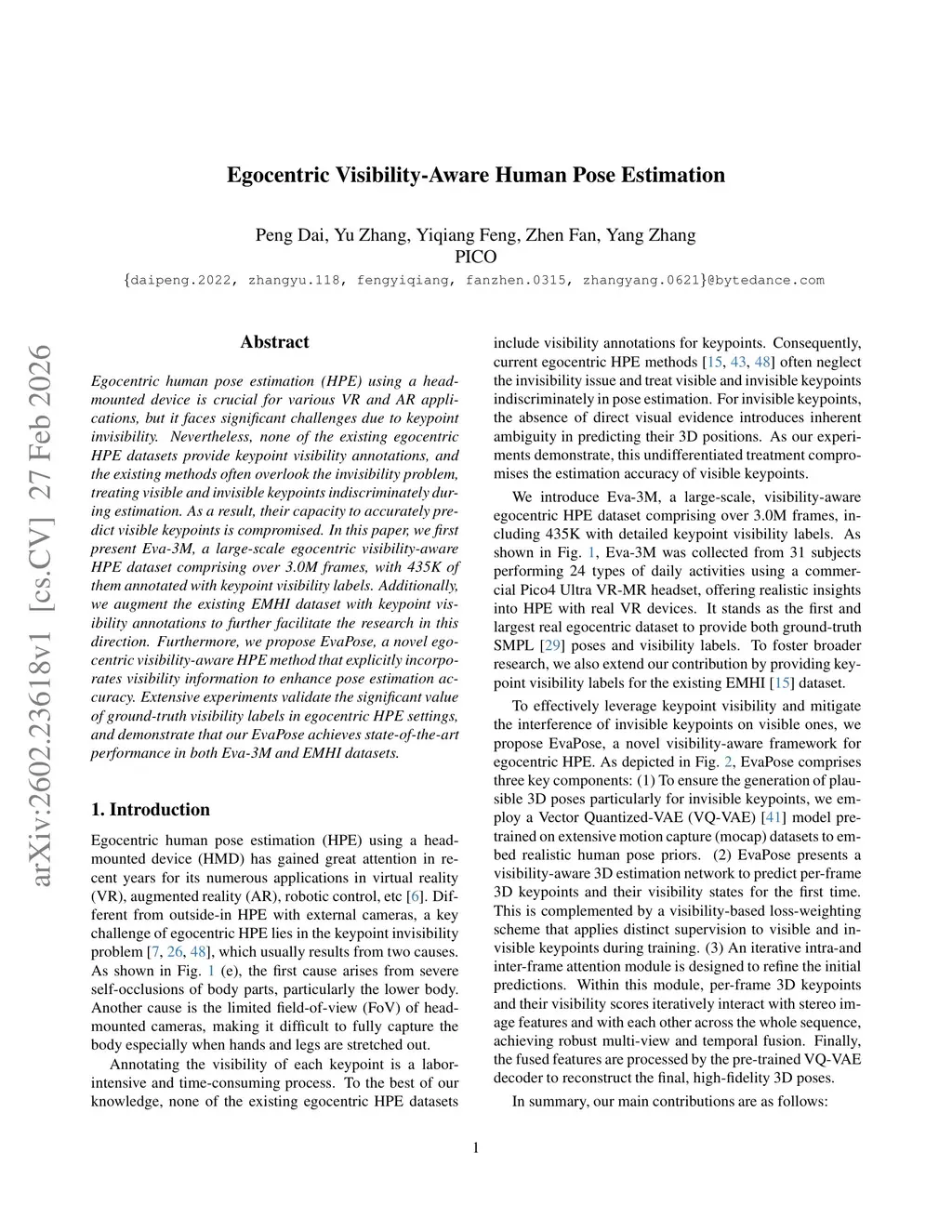 Egocentric human pose estimation (HPE) using a head-mounted device is crucial for various VR and AR applications, but it faces significant challenges due to keypoint invisibility. Nevertheless, none of the existing egocentric HPE datasets provide keypoint visibility annotations, and the existing methods often overlook the invisibility problem, treating visible and invisible keypoints indiscriminately during estimation. As a result, their capacity to accurately predict visible keypoints is compromised. In this paper, we first present Eva-3M, a large-scale egocentric visibility-aware HPE dataset comprising over 3.0M frames, with 435K of them annotated with keypoint visibility labels. Additionally, we augment the existing EMHI dataset with keypoint visibility annotations to further facilitate the research in this direction. Furthermore, we propose EvaPose, a novel egocentric visibility-aware HPE method that explicitly incorporates visibility information to enhance pose estimation accuracy. Extensive experiments validate the significant value of ground-truth visibility labels in egocentric HPE settings, and demonstrate that our EvaPose achieves state-of-the-art performance in both Eva-3M and EMHI datasets.
