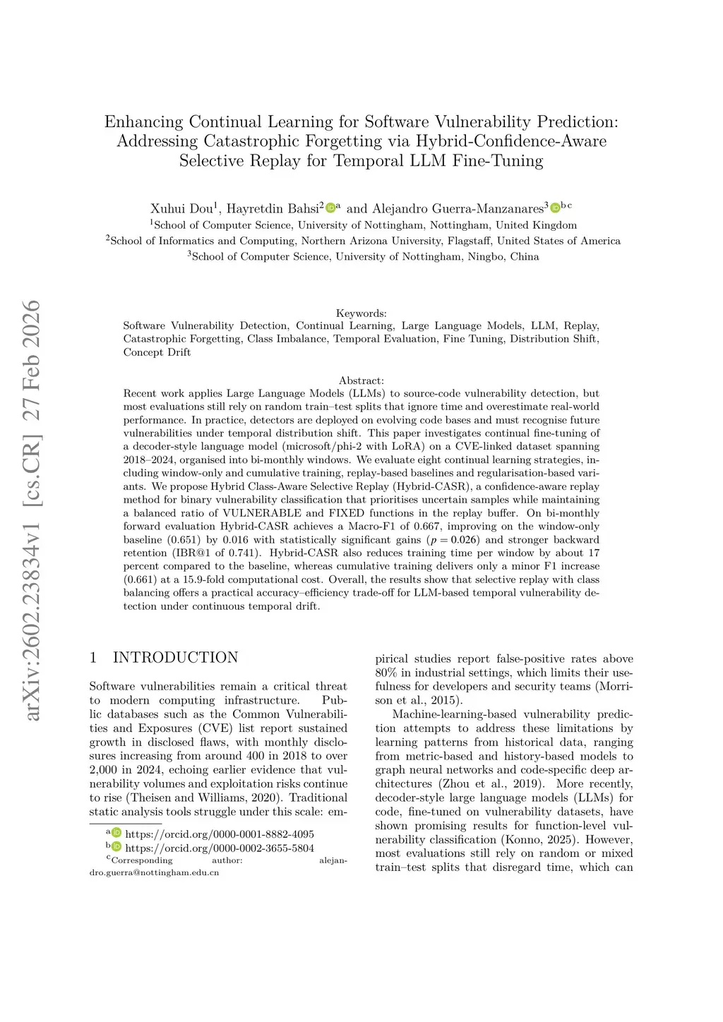 Enhancing Continual Learning for Software Vulnerability Prediction: Addressing Catastrophic Forgetting via Hybrid-Confidence-Aware Selective Replay for Temporal LLM Fine-Tuning