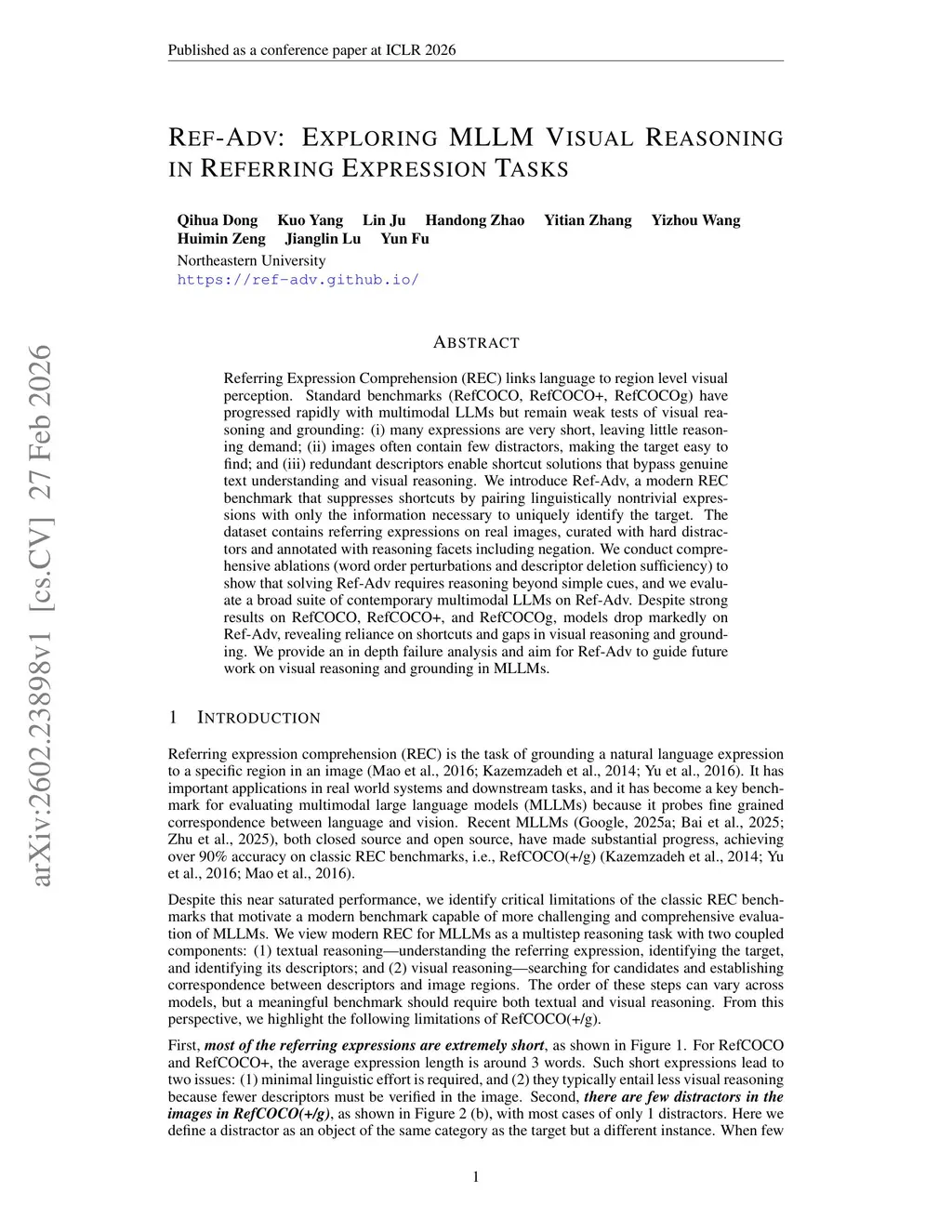 Referring Expression Comprehension (REC) links language to region level visual perception. Standard benchmarks (RefCOCO, RefCOCO+, RefCOCOg) have progressed rapidly with multimodal LLMs but remain weak tests of visual reasoning and grounding: (i) many expressions are very short, leaving little reasoning demand; (ii) images often contain few distractors, making the target easy to find; and (iii) redundant descriptors enable shortcut solutions that bypass genuine text understanding and visual reasoning. We introduce Ref-Adv, a modern REC benchmark that suppresses shortcuts by pairing linguistically nontrivial expressions with only the information necessary to uniquely identify the target. The dataset contains referring expressions on real images, curated with hard distractors and annotated with reasoning facets including negation. We conduct comprehensive ablations (word order perturbations and descriptor deletion sufficiency) to show that solving Ref-Adv requires reasoning beyond simple cues, and we evaluate a broad suite of contemporary multimodal LLMs on Ref-Adv. Despite strong results on RefCOCO, RefCOCO+, and RefCOCOg, models drop markedly on Ref-Adv, revealing reliance on shortcuts and gaps in visual reasoning and grounding. We provide an in depth failure analysis and aim for Ref-Adv to guide future work on visual reasoning and grounding in MLLMs.
