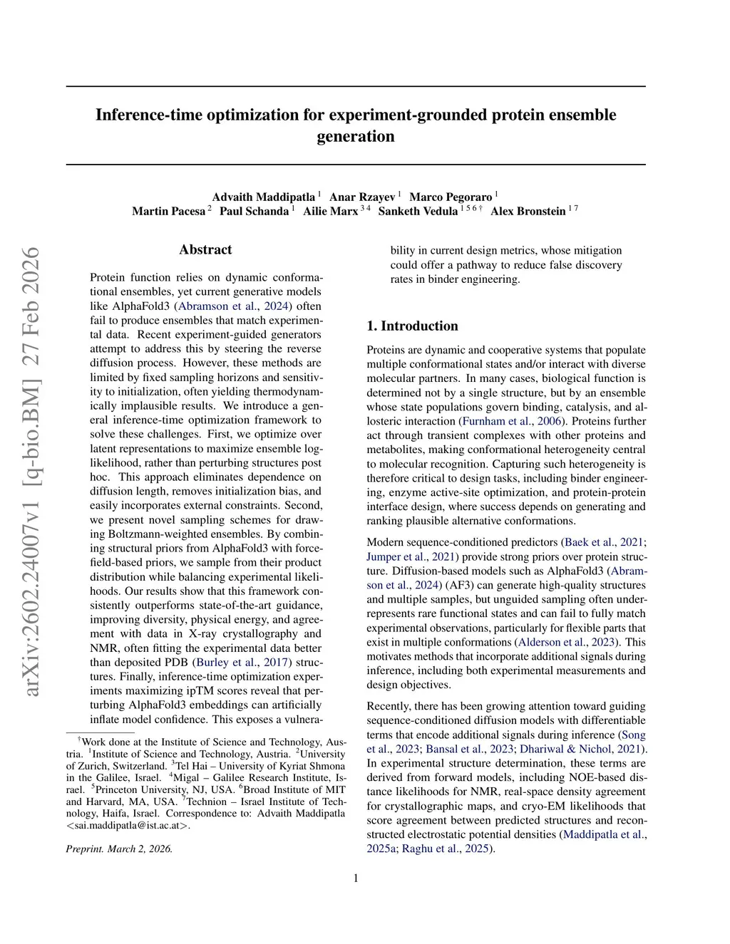 Protein function relies on dynamic conformational ensembles, yet current generative models like AlphaFold3 often fail to produce ensembles that match experimental data. Recent experiment-guided generators attempt to address this by steering the reverse diffusion process. However, these methods are limited by fixed sampling horizons and sensitivity to initialization, often yielding thermodynamically implausible results. We introduce a general inference-time optimization framework to solve these challenges. First, we optimize over latent representations to maximize ensemble log-likelihood, rather than perturbing structures post hoc. This approach eliminates dependence on diffusion length, removes initialization bias, and easily incorporates external constraints. Second, we present novel sampling schemes for drawing Boltzmann-weighted ensembles. By combining structural priors from AlphaFold3 with force-field-based priors, we sample from their product distribution while balancing experimental likelihoods. Our results show that this framework consistently outperforms state-of-the-art guidance, improving diversity, physical energy, and agreement with data in X-ray crystallography and NMR, often fitting the experimental data better than deposited PDB structures. Finally, inference-time optimization experiments maximizing ipTM scores reveal that perturbing AlphaFold3 embeddings can artificially inflate model confidence. This exposes a vulnerability in current design metrics, whose mitigation could offer a pathway to reduce false discovery rates in binder engineering.
