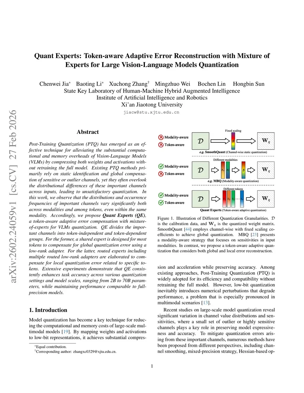 Post-Training Quantization (PTQ) has emerged as an effective technique for alleviating the substantial computational and memory overheads of Vision-Language Models (VLMs) by compressing both weights and activations without retraining the full model. Existing PTQ methods primarily rely on static identification and global compensation of sensitive or outlier channels, yet they often overlook the distributional differences of these important channels across inputs, leading to unsatisfactory quantization. In this work, we observe that the distributions and occurrence frequencies of important channels vary significantly both across modalities and among tokens, even within the same modality. Accordingly, we propose \textbf{Quant Experts (QE)}, a token-aware adaptive error compensation with mixture-of-experts for VLMs quantization. QE divides the important channels into token-independent and token-dependent groups. For the former, a shared expert is designed for most tokens to compensate for global quantization error using a low-rank adapter. For the latter, routed experts including multiple routed low-rank adapters are elaborated to compensate for local quantization error related to specific tokens. Extensive experiments demonstrate that QE consistently enhances task accuracy across various quantization settings and model scales, ranging from 2B to 70B parameters, while maintaining performance comparable to full-precision models.