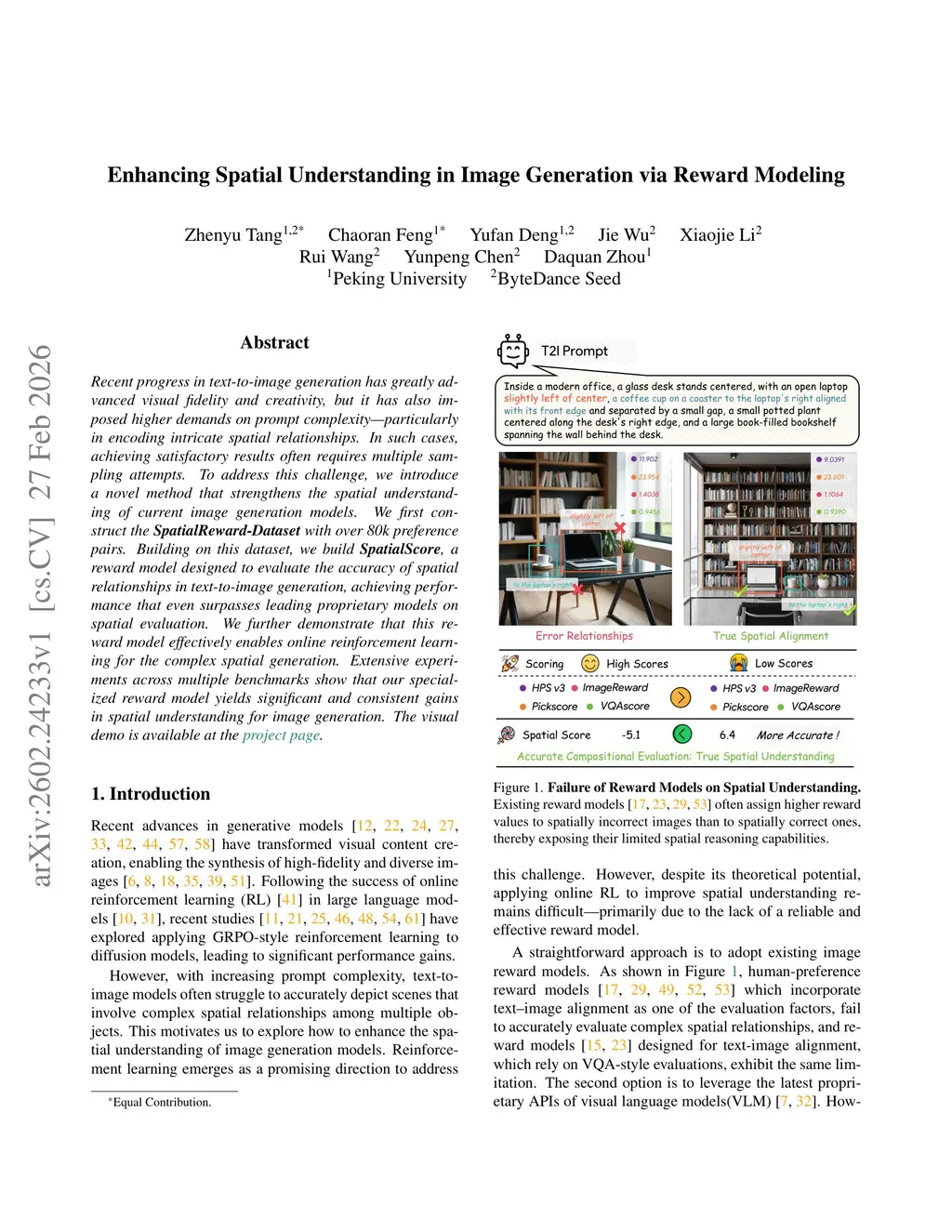 Recent progress in text-to-image generation has greatly advanced visual fidelity and creativity, but it has also imposed higher demands on prompt complexity-particularly in encoding intricate spatial relationships. In such cases, achieving satisfactory results often requires multiple sampling attempts. To address this challenge, we introduce a novel method that strengthens the spatial understanding of current image generation models. We first construct the SpatialReward-Dataset with over 80k preference pairs. Building on this dataset, we build SpatialScore, a reward model designed to evaluate the accuracy of spatial relationships in text-to-image generation, achieving performance that even surpasses leading proprietary models on spatial evaluation. We further demonstrate that this reward model effectively enables online reinforcement learning for the complex spatial generation. Extensive experiments across multiple benchmarks show that our specialized reward model yields significant and consistent gains in spatial understanding for image generation.