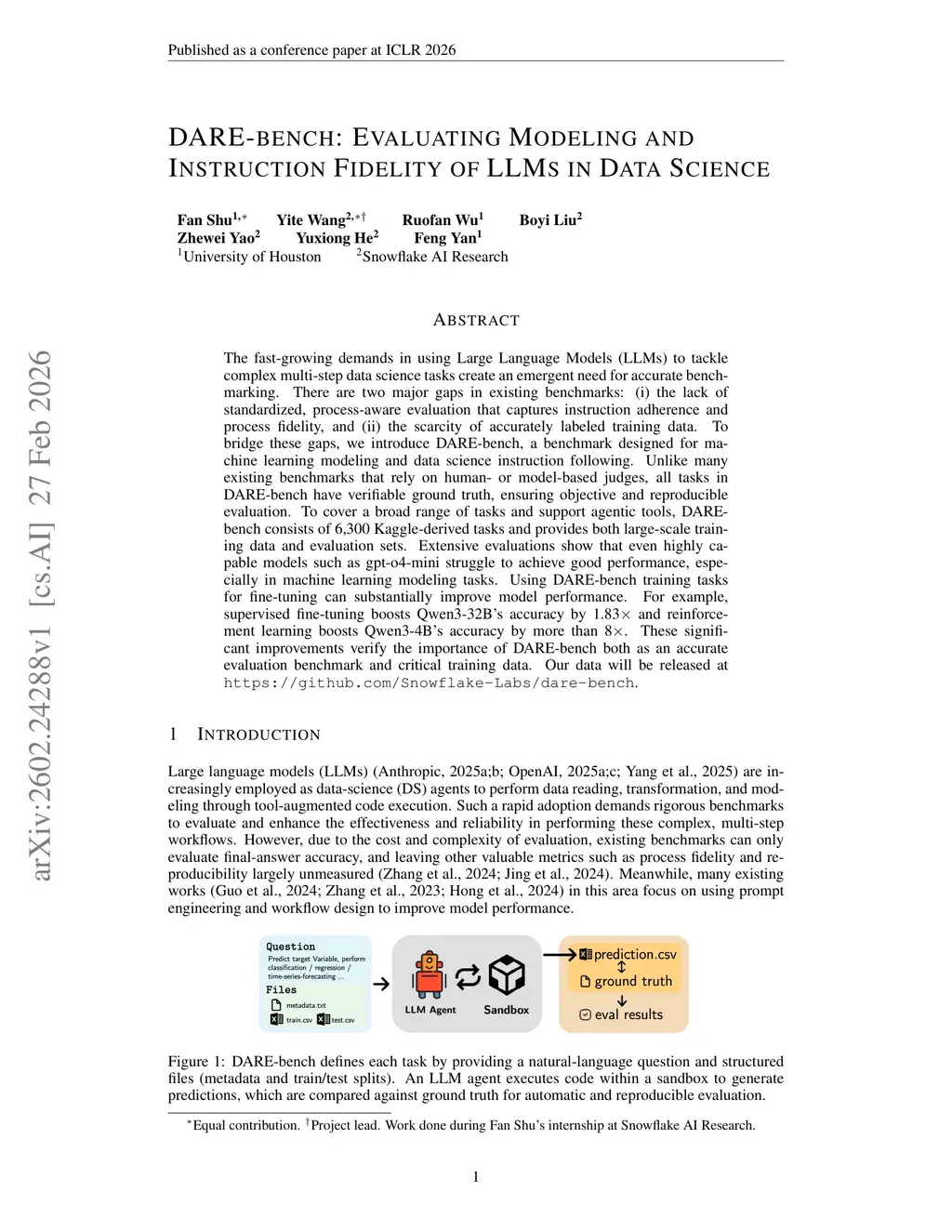 The fast-growing demands in using Large Language Models (LLMs) to tackle complex multi-step data science tasks create an emergent need for accurate benchmarking. There are two major gaps in existing benchmarks: (i) the lack of standardized, process-aware evaluation that captures instruction adherence and process fidelity, and (ii) the scarcity of accurately labeled training data. To bridge these gaps, we introduce DARE-bench, a benchmark designed for machine learning modeling and data science instruction following. Unlike many existing benchmarks that rely on human- or model-based judges, all tasks in DARE-bench have verifiable ground truth, ensuring objective and reproducible evaluation. To cover a broad range of tasks and support agentic tools, DARE-bench consists of 6,300 Kaggle-derived tasks and provides both large-scale training data and evaluation sets. Extensive evaluations show that even highly capable models such as gpt-o4-mini struggle to achieve good performance, especially in machine learning modeling tasks. Using DARE-bench training tasks for fine-tuning can substantially improve model performance. For example, supervised fine-tuning boosts Qwen3-32B's accuracy by 1.83x and reinforcement learning boosts Qwen3-4B's accuracy by more than 8x. These significant improvements verify the importance of DARE-bench both as an accurate evaluation benchmark and critical training data.