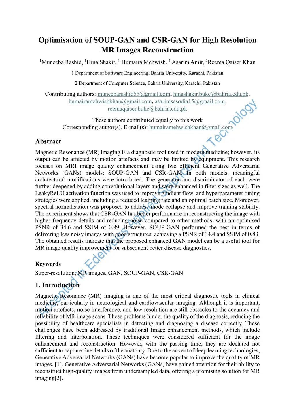 Magnetic Resonance (MR) imaging is a diagnostic tool used in modern medicine; however, its output can be affected by motion artefacts and may be limited by equipment. This research focuses on MRI image quality enhancement using two efficient Generative Adversarial Networks (GANs) models: SOUP-GAN and CSR-GAN. In both models, meaningful architectural modifications were introduced. The generator and discriminator of each were further deepened by adding convolutional layers and were enhanced in filter sizes as well. The LeakyReLU activation function was used to improve gradient flow, and hyperparameter tuning strategies were applied, including a reduced learning rate and an optimal batch size. Moreover, spectral normalisation was proposed to address mode collapse and improve training stability. The experiment shows that CSR-GAN has better performance in reconstructing the image with higher frequency details and reducing noise compared to other methods, with an optimised PSNR of 34.6 and SSIM of 0.89. However, SOUP-GAN performed the best in terms of delivering less noisy images with good structures, achieving a PSNR of 34.4 and SSIM of 0.83. The obtained results indicate that the proposed enhanced GAN model can be a useful tool for MR image quality improvement for subsequent better disease diagnostics.