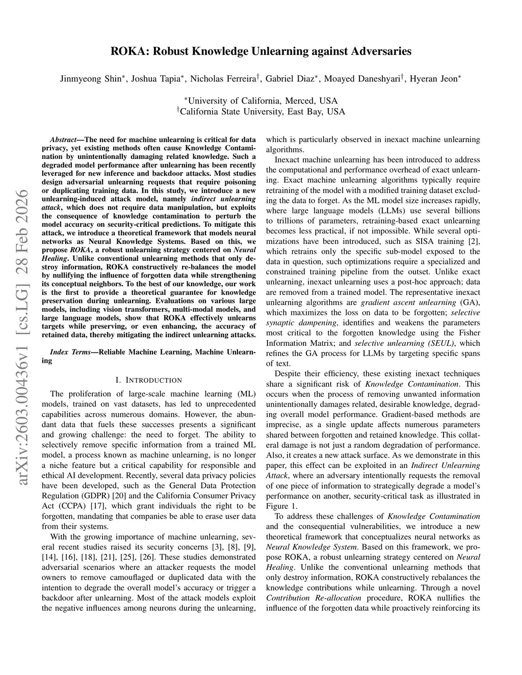 The need for machine unlearning is critical for data privacy, yet existing methods often cause Knowledge Contamination by unintentionally damaging related knowledge. Such a degraded model performance after unlearning has been recently leveraged for new inference and backdoor attacks. Most studies design adversarial unlearning requests that require poisoning or duplicating training data. In this study, we introduce a new unlearning-induced attack model, namely indirect unlearning attack, which does not require data manipulation but exploits the consequence of knowledge contamination to perturb the model accuracy on security-critical predictions. To mitigate this attack, we introduce a theoretical framework that models neural networks as Neural Knowledge Systems. Based on this, we propose ROKA, a robust unlearning strategy centered on Neural Healing. Unlike conventional unlearning methods that only destroy information, ROKA constructively rebalances the model by nullifying the influence of forgotten data while strengthening its conceptual neighbors. To the best of our knowledge, our work is the first to provide a theoretical guarantee for knowledge preservation during unlearning. Evaluations on various large models, including vision transformers, multi-modal models, and large language models, show that ROKA effectively unlearns targets while preserving, or even enhancing, the accuracy of retained data, thereby mitigating the indirect unlearning attacks.