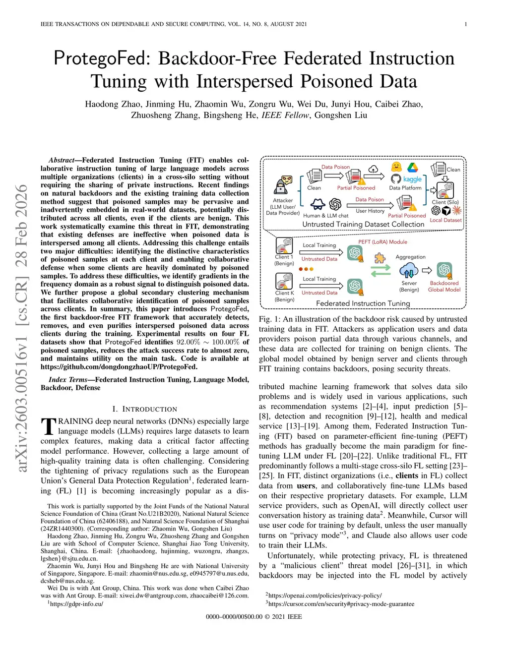 Federated Instruction Tuning (FIT) enables collaborative instruction tuning of large language models across multiple organizations (clients) in a cross-silo setting without requiring the sharing of private instructions. Recent findings on natural backdoors and the existing training data collection method suggest that poisoned samples may be pervasive and inadvertently embedded in real-world datasets, potentially distributed across all clients, even if the clients are benign. This work systematically examine this threat in FIT, demonstrating that existing defenses are ineffective when poisoned data is interspersed among all clients. Addressing this challenge entails two major difficulties: identifying the distinctive characteristics of poisoned samples at each client and enabling collaborative defense when some clients are heavily dominated by poisoned samples. To address these difficulties, we identify gradients in the frequency domain as a robust signal to distinguish poisoned data. We further propose a global secondary clustering mechanism that facilitates collaborative identification of poisoned samples across clients. In summary, this paper introduces ProtegoFed, the first backdoor-free FIT framework that accurately detects, removes, and even purifies interspersed poisoned data across clients during the training. Experimental results on four FL datasets show that ProtegoFed identifies of poisoned samples, reduces the attack success rate to almost zero, and maintains utility on the main task. Code is available atthis https URL.