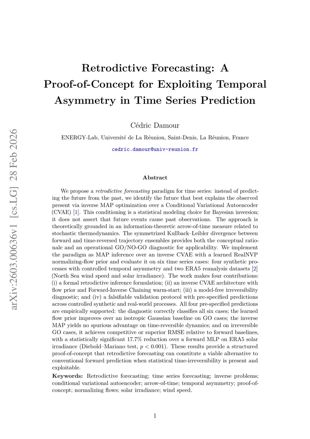 We propose a retrodictive forecasting paradigm for time series: instead of predicting the future from the past, we identify the future that best explains the observed present via inverse MAP optimization over a Conditional Variational Autoencoder (CVAE). This conditioning is a statistical modeling choice for Bayesian inversion; it does not assert that future events cause past observations. The approach is theoretically grounded in an information-theoretic arrow-of-time measure: the symmetrized Kullback-Leibler divergence between forward and time-reversed trajectory ensembles provides both the conceptual rationale and an operational GO/NO-GO diagnostic for applicability. We implement the paradigm as MAP inference over an inverse CVAE with a learned RealNVP normalizing-flow prior and evaluate it on six time series cases: four synthetic processes with controlled temporal asymmetry and two ERA5 reanalysis datasets (wind speed and solar irradiance). The work makes four contributions: (i) a formal retrodictive inference formulation; (ii) an inverse CVAE architecture; (iii) a model-free irreversibility diagnostic; and (iv) a falsifiable validation protocol with four pre-specified predictions. All pre-specified predictions are empirically supported: the diagnostic correctly classifies all six cases; the learned flow prior improves over an isotropic Gaussian baseline on GO cases; the inverse MAP yields no spurious advantage on time-reversible dynamics; and on irreversible GO cases, it achieves competitive or superior RMSE relative to forward baselines, with a statistically significant 17.7% reduction over a forward MLP on ERA5 solar irradiance. These results provide a structured proof-of-concept that retrodictive forecasting can constitute a viable alternative to conventional forward prediction when statistical time-irreversibility is present and exploitable.