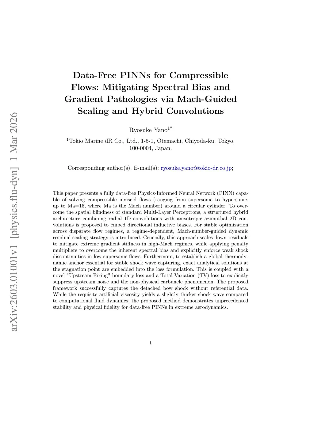 This paper presents a fully data-free Physics-Informed Neural Network (PINN) capable of solving compressible inviscid flows (ranging from supersonic to hypersonic, up to Ma=15, where Ma is the Mach number) around a circular cylinder. To overcome the spatial blindness of standard Multi-Layer Perceptrons, a structured hybrid architecture combining radial 1D convolutions with anisotropic azimuthal 2D convolutions is proposed to embed directional inductive biases. For stable optimization across disparate flow regimes, a regime-dependent, Mach-number-guided dynamic residual scaling strategy is introduced. Crucially, this approach scales down residuals to mitigate extreme gradient stiffness in high-Mach regimes, while applying penalty multipliers to overcome the inherent spectral bias and explicitly enforce weak shock discontinuities in low-supersonic flows. Furthermore, to establish a global thermodynamic anchor essential for stable shock wave capturing, exact analytical solutions at the stagnation point are embedded into the loss formulation. This is coupled with a novel "Upstream Fixing" boundary loss and a Total Variation (TV) loss to explicitly suppress upstream noise and the non-physical carbuncle phenomenon. The proposed framework successfully captures the detached bow shock without referential data. While the requisite artificial viscosity yields a slightly thicker shock wave compared to computational fluid dynamics, the proposed method demonstrates unprecedented stability and physical fidelity for data-free PINNs in extreme aerodynamics.