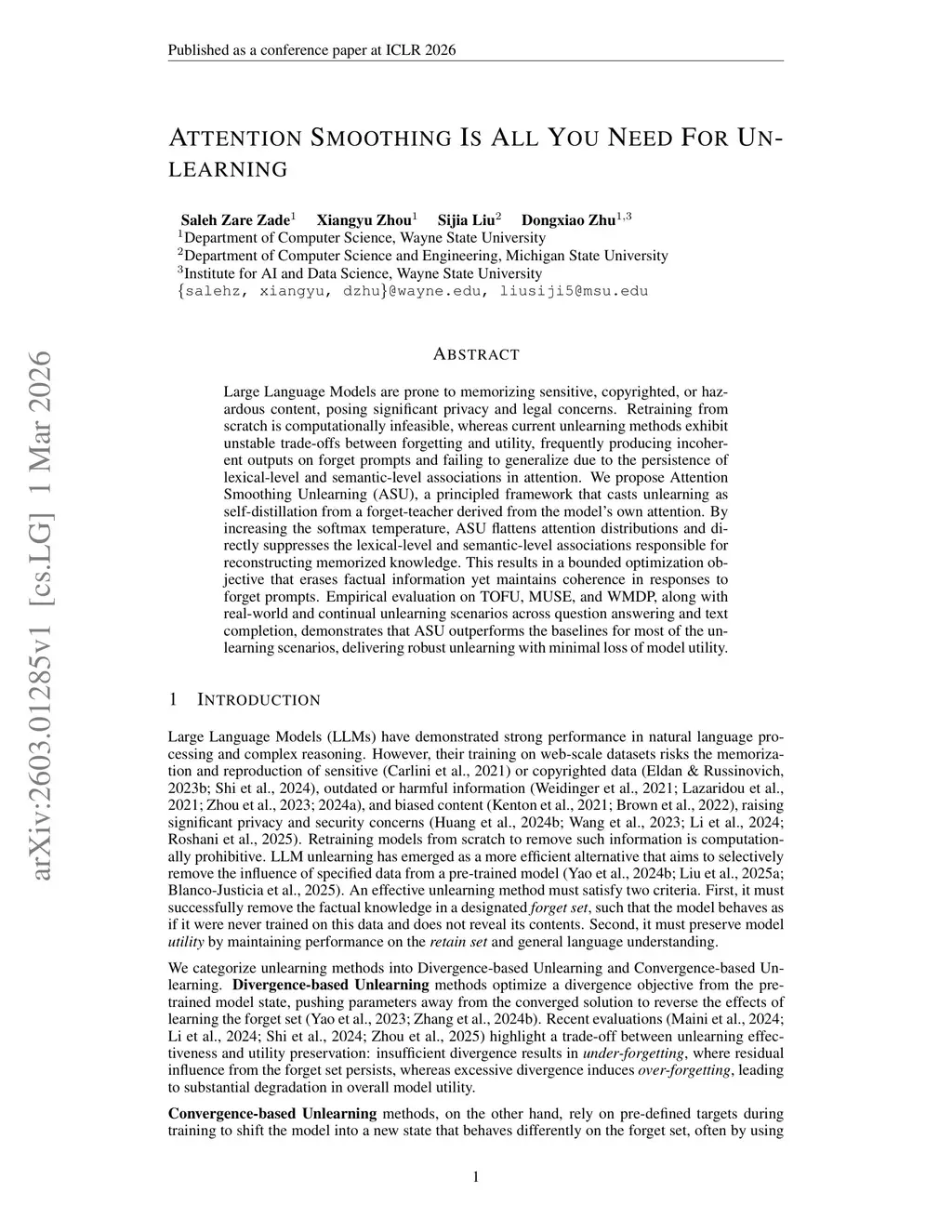 Large Language Models are prone to memorizing sensitive, copyrighted, or hazardous content, posing significant privacy and legal concerns. Retraining from scratch is computationally infeasible, whereas current unlearning methods exhibit unstable trade-offs between forgetting and utility, frequently producing incoherent outputs on forget prompts and failing to generalize due to the persistence of lexical-level and semantic-level associations in attention. We propose Attention Smoothing Unlearning (ASU), a principled framework that casts unlearning as self-distillation from a forget-teacher derived from the model's own attention. By increasing the softmax temperature, ASU flattens attention distributions and directly suppresses the lexical-level and semantic-level associations responsible for reconstructing memorized knowledge. This results in a bounded optimization objective that erases factual information yet maintains coherence in responses to forget prompts. Empirical evaluation on TOFU, MUSE, and WMDP, along with real-world and continual unlearning scenarios across question answering and text completion, demonstrates that ASU outperforms the baselines for most unlearning scenarios, delivering robust unlearning with minimal loss of model utility.