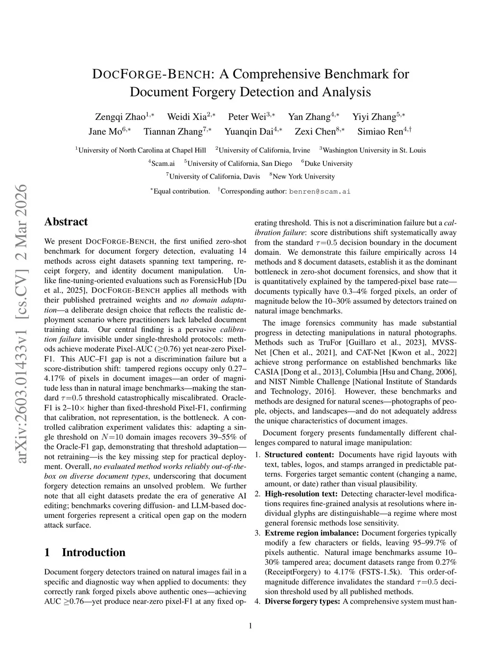 We present DOCFORGE-BENCH, the first unified zero-shot benchmark for document forgery detection, evaluating 14 methods across eight datasets spanning text tampering, receipt forgery, and identity document manipulation. Unlike fine-tuning-oriented evaluations such as ForensicHub [Du et al., 2025], DOCFORGE-BENCH applies all methods with their published pretrained weights and no domain adaptation -- a deliberate design choice that reflects the realistic deployment scenario where practitioners lack labeled document training data. Our central finding is a pervasive calibration failure invisible under single-threshold protocols: methods achieve moderate Pixel-AUC (>=0.76) yet near-zero Pixel-F1. This AUC-F1 gap is not a discrimination failure but a score-distribution shift: tampered regions occupy only 0.27-4.17% of pixels in document images -- an order of magnitude less than in natural image benchmarks -- making the standard tau=0.5 threshold catastrophically miscalibrated. Oracle-F1 is 2-10x higher than fixed-threshold Pixel-F1, confirming that calibration, not representation, is the bottleneck. A controlled calibration experiment validates this: adapting a single threshold on N=10 domain images recovers 39-55% of the Oracle-F1 gap, demonstrating that threshold adaptation -- not retraining -- is the key missing step for practical deployment. Overall, no evaluated method works reliably out-of-the-box on diverse document types, underscoring that document forgery detection remains an unsolved problem. We further note that all eight datasets predate the era of generative AI editing; benchmarks covering diffusion- and LLM-based document forgeries represent a critical open gap on the modern attack surface.