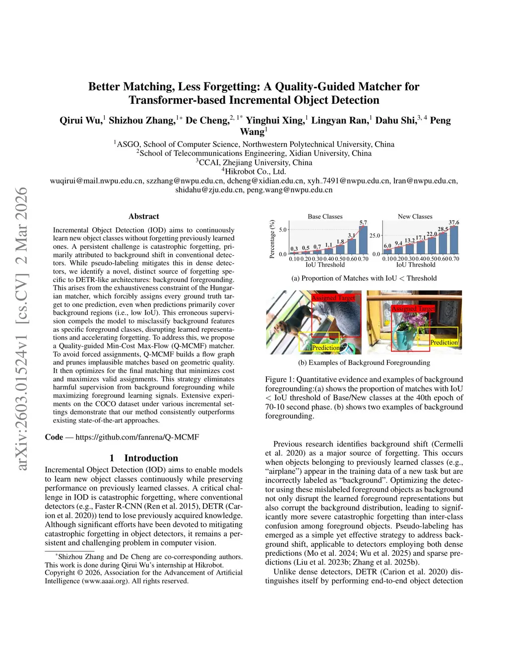 Incremental Object Detection (IOD) aims to continuously learn new object classes without forgetting previously learned ones. A persistent challenge is catastrophic forgetting, primarily attributed to background shift in conventional detectors. While pseudo-labeling mitigates this in dense detectors, we identify a novel, distinct source of forgetting specific to DETR-like architectures: background foregrounding. This arises from the exhaustiveness constraint of the Hungarian matcher, which forcibly assigns every ground truth target to one prediction, even when predictions primarily cover background regions (i.e., low IoU). This erroneous supervision compels the model to misclassify background features as specific foreground classes, disrupting learned representations and accelerating forgetting. To address this, we propose a Quality-guided Min-Cost Max-Flow (Q-MCMF) matcher. To avoid forced assignments, Q-MCMF builds a flow graph and prunes implausible matches based on geometric quality. It then optimizes for the final matching that minimizes cost and maximizes valid assignments. This strategy eliminates harmful supervision from background foregrounding while maximizing foreground learning signals. Extensive experiments on the COCO dataset under various incremental settings demonstrate that our method consistently outperforms existing state-of-the-art approaches.