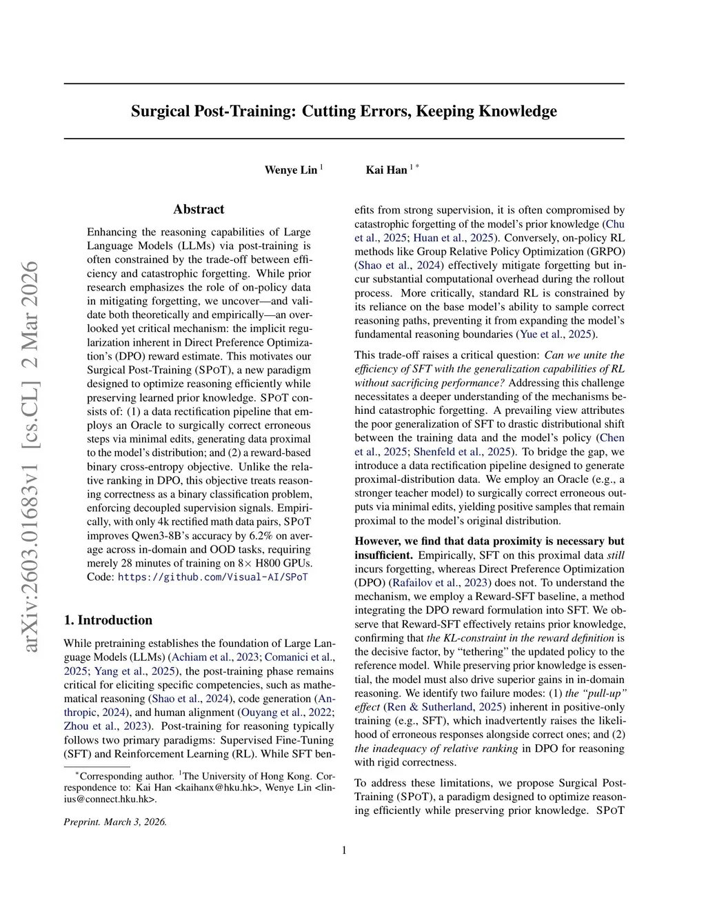 Enhancing the reasoning capabilities of Large Language Models (LLMs) via post-training is often constrained by the trade-off between efficiency and catastrophic forgetting. While prior research emphasizes the role of on-policy data in mitigating forgetting, we uncover--and validate both theoretically and empirically--an overlooked yet critical mechanism: the implicit regularization inherent in Direct Preference Optimization's (DPO) reward estimate. This motivates our Surgical Post-Training (SPoT), a new paradigm designed to optimize reasoning efficiently while preserving learned prior knowledge. SPoT consists of: (1) a data rectification pipeline that employs an Oracle to surgically correct erroneous steps via minimal edits, generating data proximal to the model's distribution; and (2) a reward-based binary cross-entropy objective. Unlike the relative ranking in DPO, this objective treats reasoning correctness as a binary classification problem, enforcing decoupled supervision signals. Empirically, with only 4k rectified math data pairs, SPoT improves Qwen3-8B's accuracy by 6.2% on average across in-domain and OOD tasks, requiring merely 28 minutes of training on 8x H800 GPUs. Code:this https URL