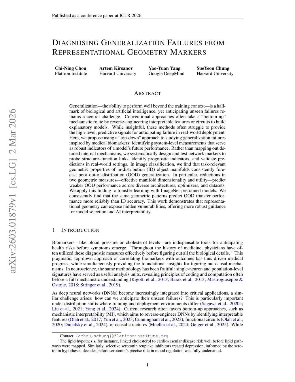 Generalization, the ability to perform well beyond the training context, is a hallmark of biological and artificial intelligence, yet anticipating unseen failures remains a central challenge. Conventional approaches often take a ``bottom-up'' mechanistic route by reverse-engineering interpretable features or circuits to build explanatory models. While insightful, these methods often struggle to provide the high-level, predictive signals for anticipating failure in real-world deployment. Here, we propose using a ``top-down'' approach to studying generalization failures inspired by medical biomarkers: identifying system-level measurements that serve as robust indicators of a model's future performance. Rather than mapping out detailed internal mechanisms, we systematically design and test network markers to probe structure, function links, identify prognostic indicators, and validate predictions in real-world settings. In image classification, we find that task-relevant geometric properties of in-distribution (ID) object manifolds consistently forecast poor out-of-distribution (OOD) generalization. In particular, reductions in two geometric measures, effective manifold dimensionality and utility, predict weaker OOD performance across diverse architectures, optimizers, and datasets. We apply this finding to transfer learning with ImageNet-pretrained models. We consistently find that the same geometric patterns predict OOD transfer performance more reliably than ID accuracy. This work demonstrates that representational geometry can expose hidden vulnerabilities, offering more robust guidance for model selection and AI interpretability.