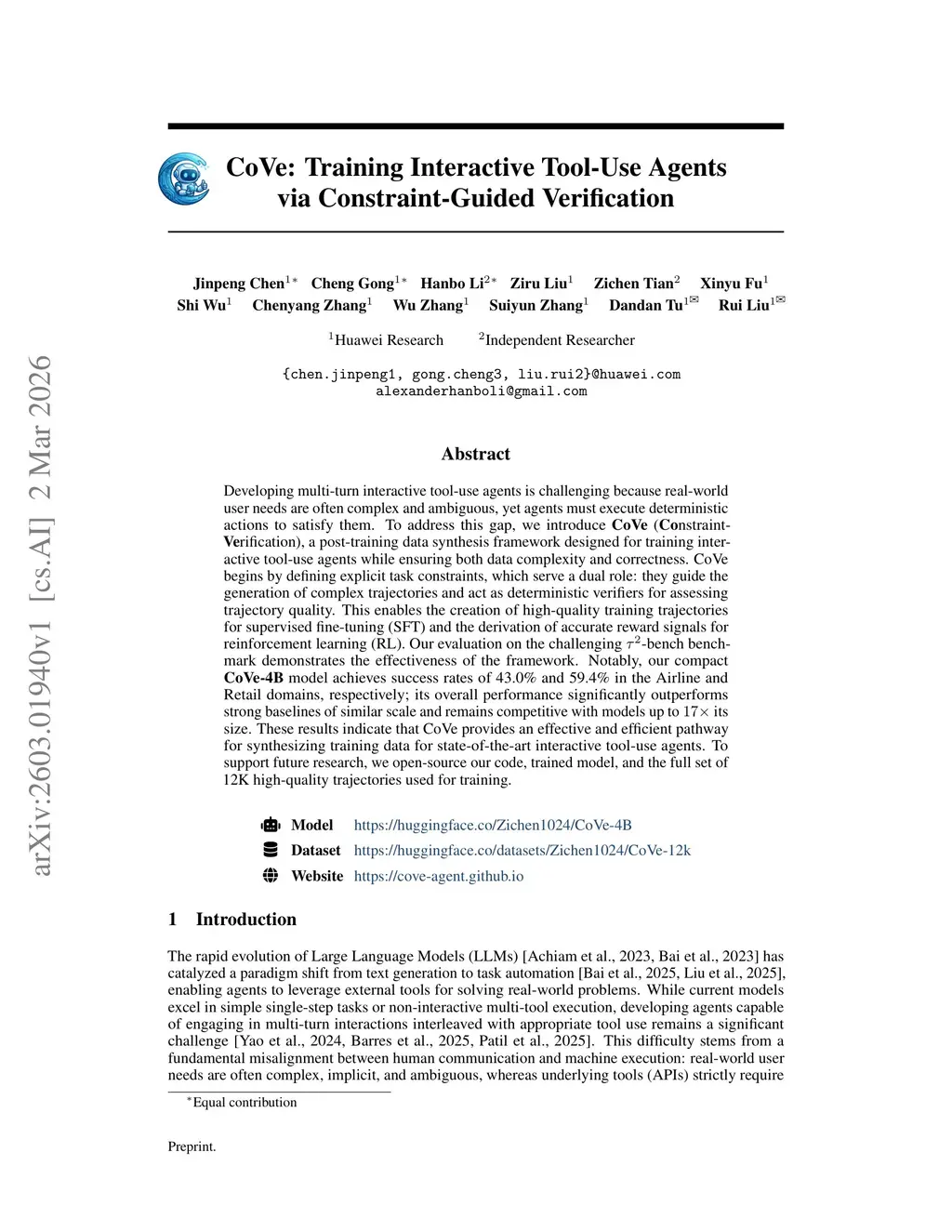 Developing multi-turn interactive tool-use agents is challenging because real-world user needs are often complex and ambiguous, yet agents must execute deterministic actions to satisfy them. To address this gap, we introduce \textbf{CoVe} (\textbf{Co}nstraint-\textbf{Ve}rification), a post-training data synthesis framework designed for training interactive tool-use agents while ensuring both data complexity and correctness. CoVe begins by defining explicit task constraints, which serve a dual role: they guide the generation of complex trajectories and act as deterministic verifiers for assessing trajectory quality. This enables the creation of high-quality training trajectories for supervised fine-tuning (SFT) and the derivation of accurate reward signals for reinforcement learning (RL). Our evaluation on the challenging -bench benchmark demonstrates the effectiveness of the framework. Notably, our compact \textbf{CoVe-4B} model achieves success rates of 43.0\% and 59.4\% in the Airline and Retail domains, respectively; its overall performance significantly outperforms strong baselines of similar scale and remains competitive with models up to its size. These results indicate that CoVe provides an effective and efficient pathway for synthesizing training data for state-of-the-art interactive tool-use agents. To support future research, we open-source our code, trained model, and the full set of 12K high-quality trajectories used for training.