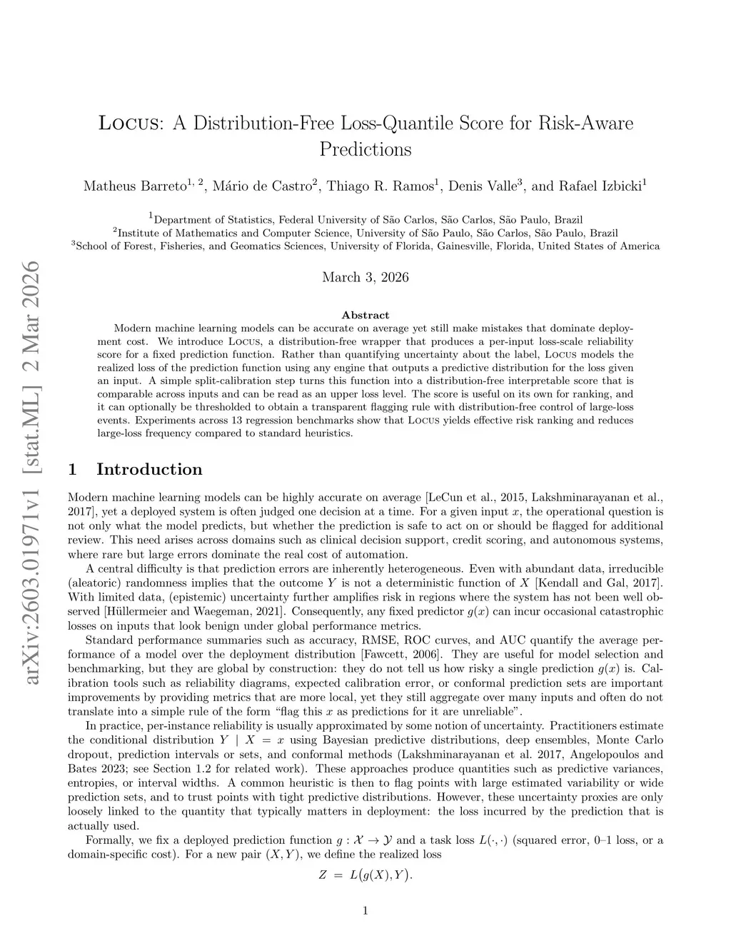 Modern machine learning models can be accurate on average yet still make mistakes that dominate deployment cost. We introduce Locus, a distribution-free wrapper that produces a per-input loss-scale reliability score for a fixed prediction function. Rather than quantifying uncertainty about the label, Locus models the realized loss of the prediction function using any engine that outputs a predictive distribution for the loss given an input. A simple split-calibration step turns this function into a distribution-free interpretable score that is comparable across inputs and can be read as an upper loss level. The score is useful on its own for ranking, and it can optionally be thresholded to obtain a transparent flagging rule with distribution-free control of large-loss events. Experiments across 13 regression benchmarks show that Locus yields effective risk ranking and reduces large-loss frequency compared to standard heuristics.