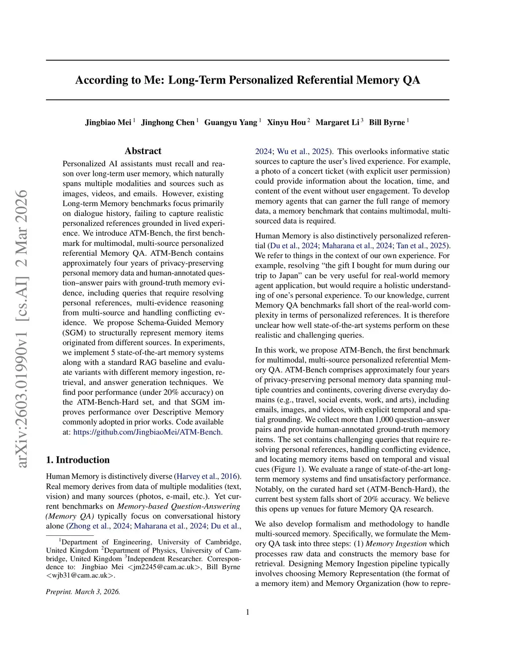 Personalized AI assistants must recall and reason over long-term user memory, which naturally spans multiple modalities and sources such as images, videos, and emails. However, existing Long-term Memory benchmarks focus primarily on dialogue history, failing to capture realistic personalized references grounded in lived experience. We introduce ATM-Bench, the first benchmark for multimodal, multi-source personalized referential Memory QA. ATM-Bench contains approximately four years of privacy-preserving personal memory data and human-annotated question-answer pairs with ground-truth memory evidence, including queries that require resolving personal references, multi-evidence reasoning from multi-source and handling conflicting evidence. We propose Schema-Guided Memory (SGM) to structurally represent memory items originated from different sources. In experiments, we implement 5 state-of-the-art memory systems along with a standard RAG baseline and evaluate variants with different memory ingestion, retrieval, and answer generation techniques. We find poor performance (under 20\% accuracy) on the ATM-Bench-Hard set, and that SGM improves performance over Descriptive Memory commonly adopted in prior works. Code available at:this https URL
