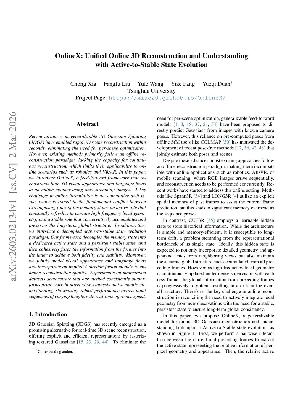 Recent advances in generalizable 3D Gaussian Splatting (3DGS) have enabled rapid 3D scene reconstruction within seconds, eliminating the need for per-scene optimization. However, existing methods primarily follow an offline reconstruction paradigm, lacking the capacity for continuous reconstruction, which limits their applicability to online scenarios such as robotics and VR/AR. In this paper, we introduce OnlineX, a feed-forward framework that reconstructs both 3D visual appearance and language fields in an online manner using only streaming images. A key challenge in online formulation is the cumulative drift issue, which is rooted in the fundamental conflict between two opposing roles of the memory state: an active role that constantly refreshes to capture high-frequency local geometry, and a stable role that conservatively accumulates and preserves the long-term global structure. To address this, we introduce a decoupled active-to-stable state evolution paradigm. Our framework decouples the memory state into a dedicated active state and a persistent stable state, and then cohesively fuses the information from the former into the latter to achieve both fidelity and stability. Moreover, we jointly model visual appearance and language fields and incorporate an implicit Gaussian fusion module to enhance reconstruction quality. Experiments on mainstream datasets demonstrate that our method consistently outperforms prior work in novel view synthesis and semantic understanding, showcasing robust performance across input sequences of varying lengths with real-time inference speed.