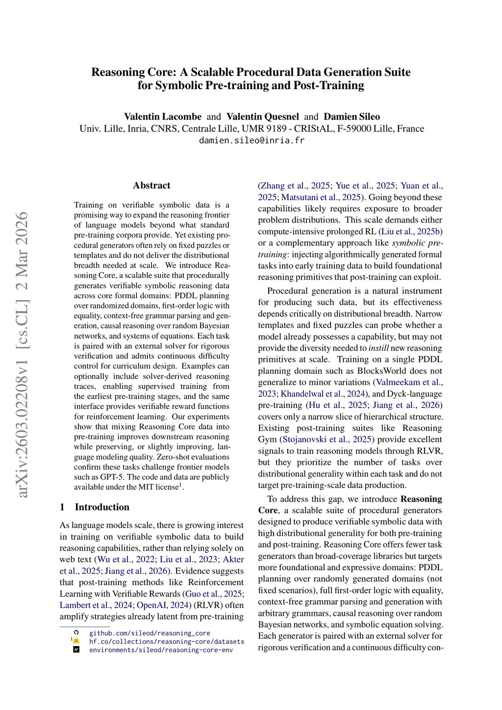 Training on verifiable symbolic data is a promising way to expand the reasoning frontier of language models beyond what standard pre-training corpora provide. Yet existing procedural generators often rely on fixed puzzles or templates and do not deliver the distributional breadth needed at scale. We introduce Reasoning Core, a scalable suite that procedurally generates verifiable symbolic reasoning data across core formal domains: PDDL planning over randomized domains, first-order logic with equality, context-free grammar parsing and generation, causal reasoning over random Bayesian networks, and systems of equations. Each task is paired with an external solver for rigorous verification and admits continuous difficulty control for curriculum design. Examples can optionally include solver-derived reasoning traces, enabling supervised training from the earliest pre-training stages, and the same interface provides verifiable reward functions for reinforcement learning. Our experiments show that mixing Reasoning Core data into pre-training improves downstream reasoning while preserving, or slightly improving, language modeling quality. Zero-shot evaluations confirm these tasks challenge frontier models such as GPT-5. The code and data are publicly available under the MIT license.