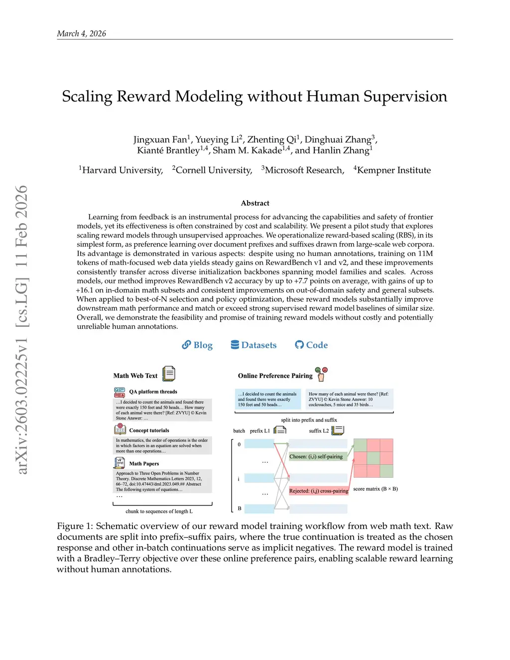 Learning from feedback is an instrumental process for advancing the capabilities and safety of frontier models, yet its effectiveness is often constrained by cost and scalability. We present a pilot study that explores scaling reward models through unsupervised approaches. We operationalize reward-based scaling (RBS), in its simplest form, as preference learning over document prefixes and suffixes drawn from large-scale web corpora. Its advantage is demonstrated in various aspects: despite using no human annotations, training on 11M tokens of math-focused web data yields steady gains on RewardBench v1 and v2, and these improvements consistently transfer across diverse initialization backbones spanning model families and scales. Across models, our method improves RewardBench v2 accuracy by up to +7.7 points on average, with gains of up to +16.1 on in-domain math subsets and consistent improvements on out-of-domain safety and general subsets. When applied to best-of-N selection and policy optimization, these reward models substantially improve downstream math performance and match or exceed strong supervised reward model baselines of similar size. Overall, we demonstrate the feasibility and promise of training reward models without costly and potentially unreliable human annotations.