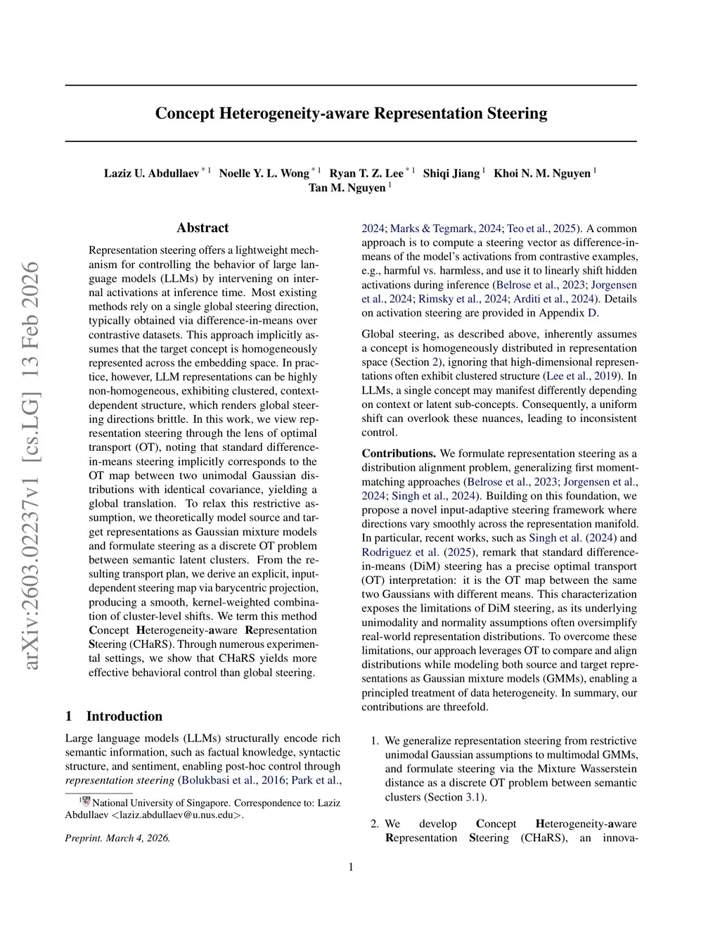 Representation steering offers a lightweight mechanism for controlling the behavior of large language models (LLMs) by intervening on internal activations at inference time. Most existing methods rely on a single global steering direction, typically obtained via difference-in-means over contrastive datasets. This approach implicitly assumes that the target concept is homogeneously represented across the embedding space. In practice, however, LLM representations can be highly non-homogeneous, exhibiting clustered, context-dependent structure, which renders global steering directions brittle. In this work, we view representation steering through the lens of optimal transport (OT), noting that standard difference-in-means steering implicitly corresponds to the OT map between two unimodal Gaussian distributions with identical covariance, yielding a global translation. To relax this restrictive assumption, we theoretically model source and target representations as Gaussian mixture models and formulate steering as a discrete OT problem between semantic latent clusters. From the resulting transport plan, we derive an explicit, input-dependent steering map via barycentric projection, producing a smooth, kernel-weighted combination of cluster-level shifts. We term this method Concept Heterogeneity-aware Representation Steering (CHaRS). Through numerous experimental settings, we show that CHaRS yields more effective behavioral control than global steering.