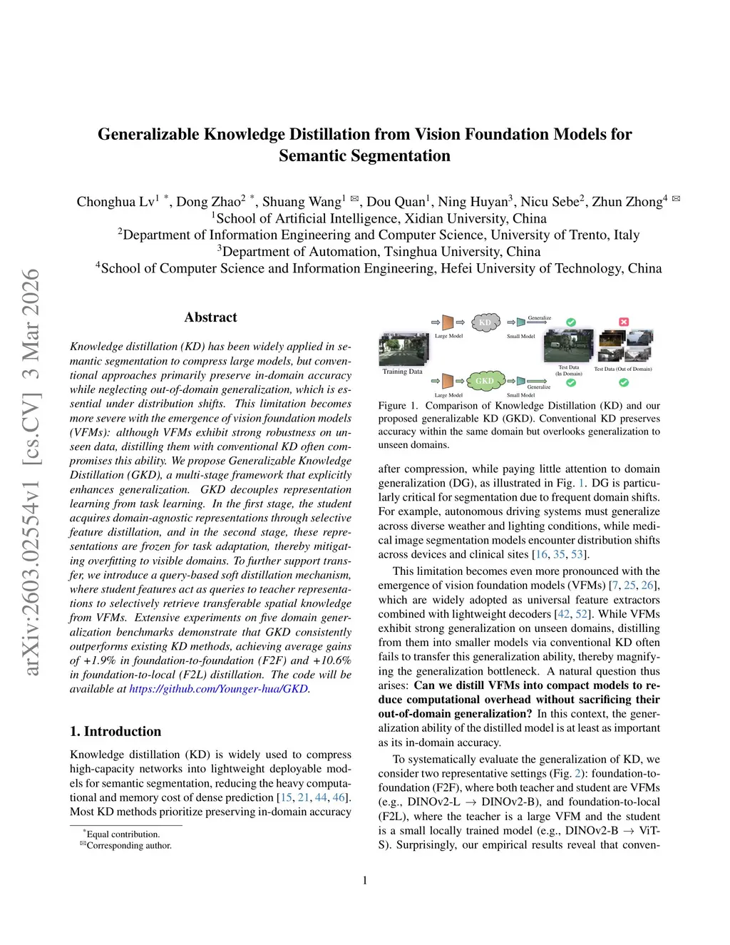 Knowledge distillation (KD) has been widely applied in semantic segmentation to compress large models, but conventional approaches primarily preserve in-domain accuracy while neglecting out-of-domain generalization, which is essential under distribution shifts. This limitation becomes more severe with the emergence of vision foundation models (VFMs): although VFMs exhibit strong robustness on unseen data, distilling them with conventional KD often compromises this ability. We propose Generalizable Knowledge Distillation (GKD), a multi-stage framework that explicitly enhances generalization. GKD decouples representation learning from task learning. In the first stage, the student acquires domain-agnostic representations through selective feature distillation, and in the second stage, these representations are frozen for task adaptation, thereby mitigating overfitting to visible domains. To further support transfer, we introduce a query-based soft distillation mechanism, where student features act as queries to teacher representations to selectively retrieve transferable spatial knowledge from VFMs. Extensive experiments on five domain generalization benchmarks demonstrate that GKD consistently outperforms existing KD methods, achieving average gains of +1.9% in foundation-to-foundation (F2F) and +10.6% in foundation-to-local (F2L) distillation. The code will be available atthis https URL.