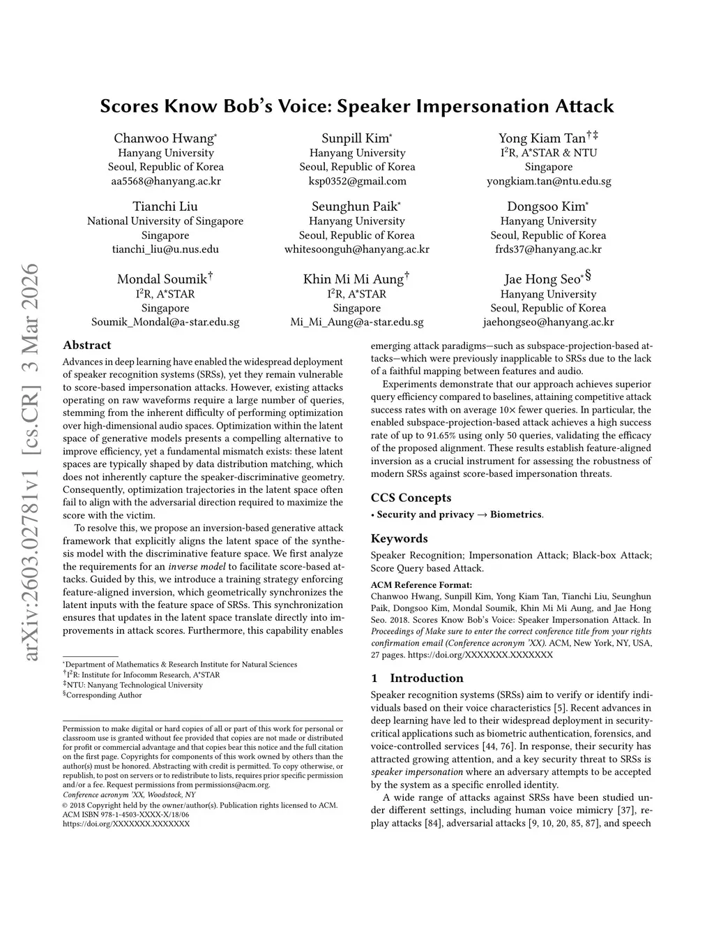 Advances in deep learning have enabled the widespread deployment of speaker recognition systems (SRSs), yet they remain vulnerable to score-based impersonation attacks. Existing attacks that operate directly on raw waveforms require a large number of queries due to the difficulty of optimizing in high-dimensional audio spaces. Latent-space optimization within generative models offers improved efficiency, but these latent spaces are shaped by data distribution matching and do not inherently capture speaker-discriminative geometry. As a result, optimization trajectories often fail to align with the adversarial direction needed to maximize victim scores.To address this limitation, we propose an inversion-based generative attack framework that explicitly aligns the latent space of the synthesis model with the discriminative feature space of SRSs. We first analyze the requirements of an inverse model for score-based attacks and introduce a feature-aligned inversion strategy that geometrically synchronizes latent representations with speaker embeddings. This alignment ensures that latent updates directly translate into score improvements. Moreover, it enables new attack paradigms, including subspace-projection-based attacks, which were previously infeasible due to the absence of a faithful feature-to-audio mapping.Experiments show that our method significantly improves query efficiency, achieving competitive attack success rates with on average 10x fewer queries than prior approaches. In particular, the enabled subspace-projection-based attack attains up to 91.65% success using only 50 queries. These findings establish feature-aligned inversion as a key tool for evaluating the robustness of modern SRSs against score-based impersonation threats.