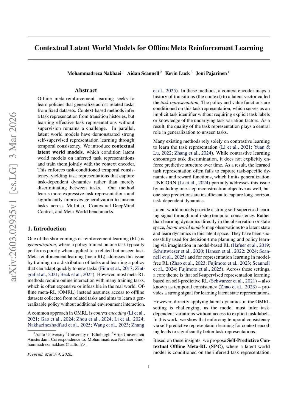 Offline meta-reinforcement learning seeks to learn policies that generalize across related tasks from fixed datasets. Context-based methods infer a task representation from transition histories, but learning effective task representations without supervision remains a challenge. In parallel, latent world models have demonstrated strong self-supervised representation learning through temporal consistency. We introduce contextual latent world models, which condition latent world models on inferred task representations and train them jointly with the context encoder. This enforces task-conditioned temporal consistency, yielding task representations that capture task-dependent dynamics rather than merely discriminating between tasks. Our method learns more expressive task representations and significantly improves generalization to unseen tasks across MuJoCo, Contextual-DeepMind Control, and Meta-World benchmarks.