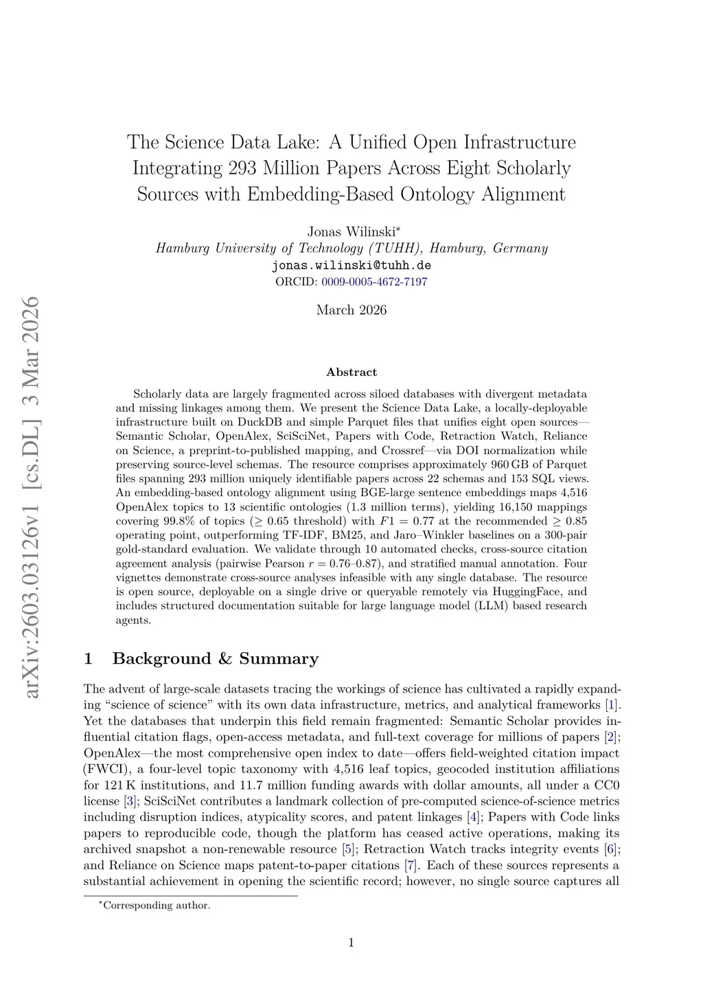 Scholarly data are largely fragmented across siloed databases with divergent metadata and missing linkages among them. We present the Science Data Lake, a locally-deployable infrastructure built on DuckDB and simple Parquet files that unifies eight open sources - Semantic Scholar, OpenAlex, SciSciNet, Papers with Code, Retraction Watch, Reliance on Science, a preprint-to-published mapping, and Crossref - via DOI normalization while preserving source-level schemas. The resource comprises approximately 960GB of Parquet files spanning ~293 million uniquely identifiable papers across ~22 schemas and ~153 SQL views. An embedding-based ontology alignment using BGE-large sentence embeddings maps 4,516 OpenAlex topics to 13 scientific ontologies (~1.3 million terms), yielding 16,150 mappings covering 99.8% of topics ( threshold) with at the recommended operating point, outperforming TF-IDF, BM25, and Jaro-Winkler baselines on a 300-pair gold-standard evaluation. We validate through 10 automated checks, cross-source citation agreement analysis (pairwise Pearson - ), and stratified manual annotation. Four vignettes demonstrate cross-source analyses infeasible with any single database. The resource is open source, deployable on a single drive or queryable remotely via HuggingFace, and includes structured documentation suitable for large language model (LLM) based research agents.