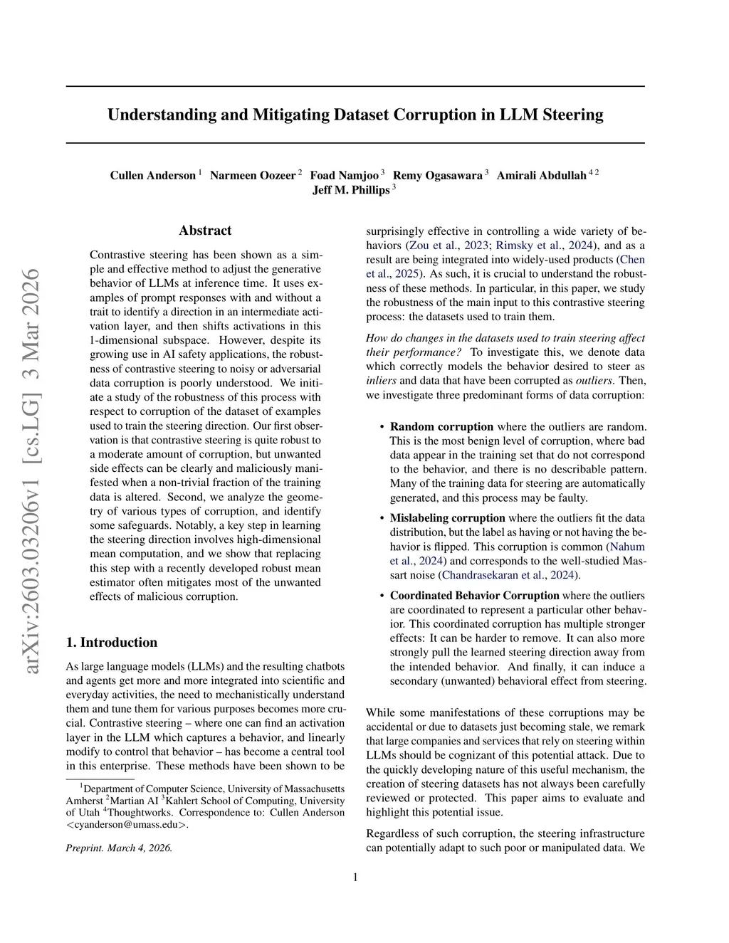 Contrastive steering has been shown as a simple and effective method to adjust the generative behavior of LLMs at inference time. It uses examples of prompt responses with and without a trait to identify a direction in an intermediate activation layer, and then shifts activations in this 1-dimensional subspace. However, despite its growing use in AI safety applications, the robustness of contrastive steering to noisy or adversarial data corruption is poorly understood. We initiate a study of the robustness of this process with respect to corruption of the dataset of examples used to train the steering direction. Our first observation is that contrastive steering is quite robust to a moderate amount of corruption, but unwanted side effects can be clearly and maliciously manifested when a non-trivial fraction of the training data is altered. Second, we analyze the geometry of various types of corruption, and identify some safeguards. Notably, a key step in learning the steering direction involves high-dimensional mean computation, and we show that replacing this step with a recently developed robust mean estimator often mitigates most of the unwanted effects of malicious corruption.
