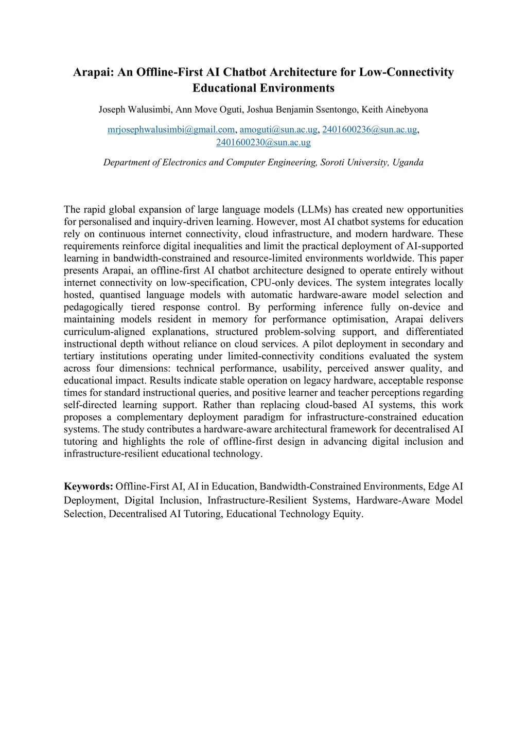 Artificial intelligence (AI) and large language models (LLMs) are transforming educational technology by enabling conversational tutoring, personalized explanations, and inquiry-driven learning. However, most AI-based learning systems rely on continuous internet connectivity and cloud-based computation, limiting their use in bandwidth-constrained environments. This paper presents an offline-first large language model architecture designed for AI-assisted learning in low-connectivity settings. The system performs all inference locally using quantized language models and incorporates hardware-aware model selection to enable deployment on low-specification CPU-only devices. By removing dependence on cloud infrastructure, the system provides curriculum-aligned explanations and structured academic support through natural-language interaction. To support learners at different educational stages, the system includes adaptive response levels that generate explanations at varying levels of complexity: Simple English, Lower Secondary, Upper Secondary, and Technical. This allows explanations to be adjusted to student ability, improving clarity and understanding of academic concepts. The system was deployed in selected secondary and tertiary institutions under limited-connectivity conditions and evaluated across technical performance, usability, perceived response quality, and educational impact. Results show stable operation on legacy hardware, acceptable response times, and positive user perceptions regarding support for self-directed learning. These findings demonstrate the feasibility of offline large language model deployment for AI-assisted education in low-connectivity environments.