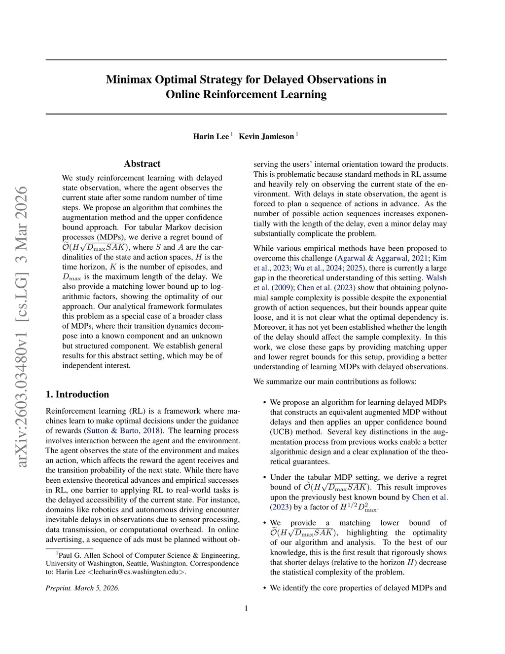 Minimax Optimal Strategy for Delayed Observations in Online Reinforcement Learning