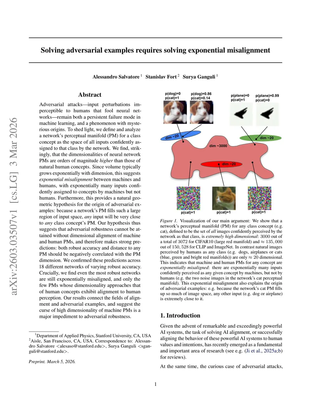 Adversarial attacks - input perturbations imperceptible to humans that fool neural networks - remain both a persistent failure mode in machine learning, and a phenomenon with mysterious origins. To shed light, we define and analyze a network's perceptual manifold (PM) for a class concept as the space of all inputs confidently assigned to that class by the network. We find, strikingly, that the dimensionalities of neural network PMs are orders of magnitude higher than those of natural human concepts. Since volume typically grows exponentially with dimension, this suggests exponential misalignment between machines and humans, with exponentially many inputs confidently assigned to concepts by machines but not humans. Furthermore, this provides a natural geometric hypothesis for the origin of adversarial examples: because a network's PM fills such a large region of input space, any input will be very close to any class concept's PM. Our hypothesis thus suggests that adversarial robustness cannot be attained without dimensional alignment of machine and human PMs, and therefore makes strong predictions: both robust accuracy and distance to any PM should be negatively correlated with the PM dimension. We confirmed these predictions across 18 different networks of varying robust accuracy. Crucially, we find even the most robust networks are still exponentially misaligned, and only the few PMs whose dimensionality approaches that of human concepts exhibit alignment to human perception. Our results connect the fields of alignment and adversarial examples, and suggest the curse of high dimensionality of machine PMs is a major impediment to adversarial robustness.