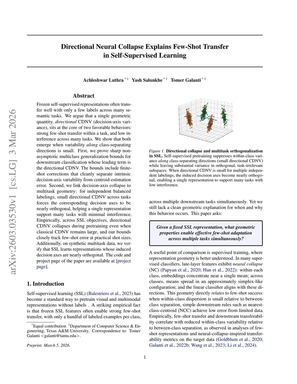 Frozen self-supervised representations often transfer well with only a few labels across many semantic tasks. We argue that a single geometric quantity, \emph{directional} CDNV (decision-axis variance), sits at the core of two favorable behaviors: strong few-shot transfer within a task, and low interference across many tasks. We show that both emerge when variability \emph{along} class-separating directions is small. First, we prove sharp non-asymptotic multiclass generalization bounds for downstream classification whose leading term is the directional CDNV. The bounds include finite-shot corrections that cleanly separate intrinsic decision-axis variability from centroid-estimation error. Second, we link decision-axis collapse to multitask geometry: for independent balanced labelings, small directional CDNV across tasks forces the corresponding decision axes to be nearly orthogonal, helping a single representation support many tasks with minimal interference. Empirically, across SSL objectives, directional CDNV collapses during pretraining even when classical CDNV remains large, and our bounds closely track few-shot error at practical shot sizes. Additionally, on synthetic multitask data, we verify that SSL learns representations whose induced decision axes are nearly orthogonal. The code and project page of the paper are available at [\href{this https URL}{project page}].
