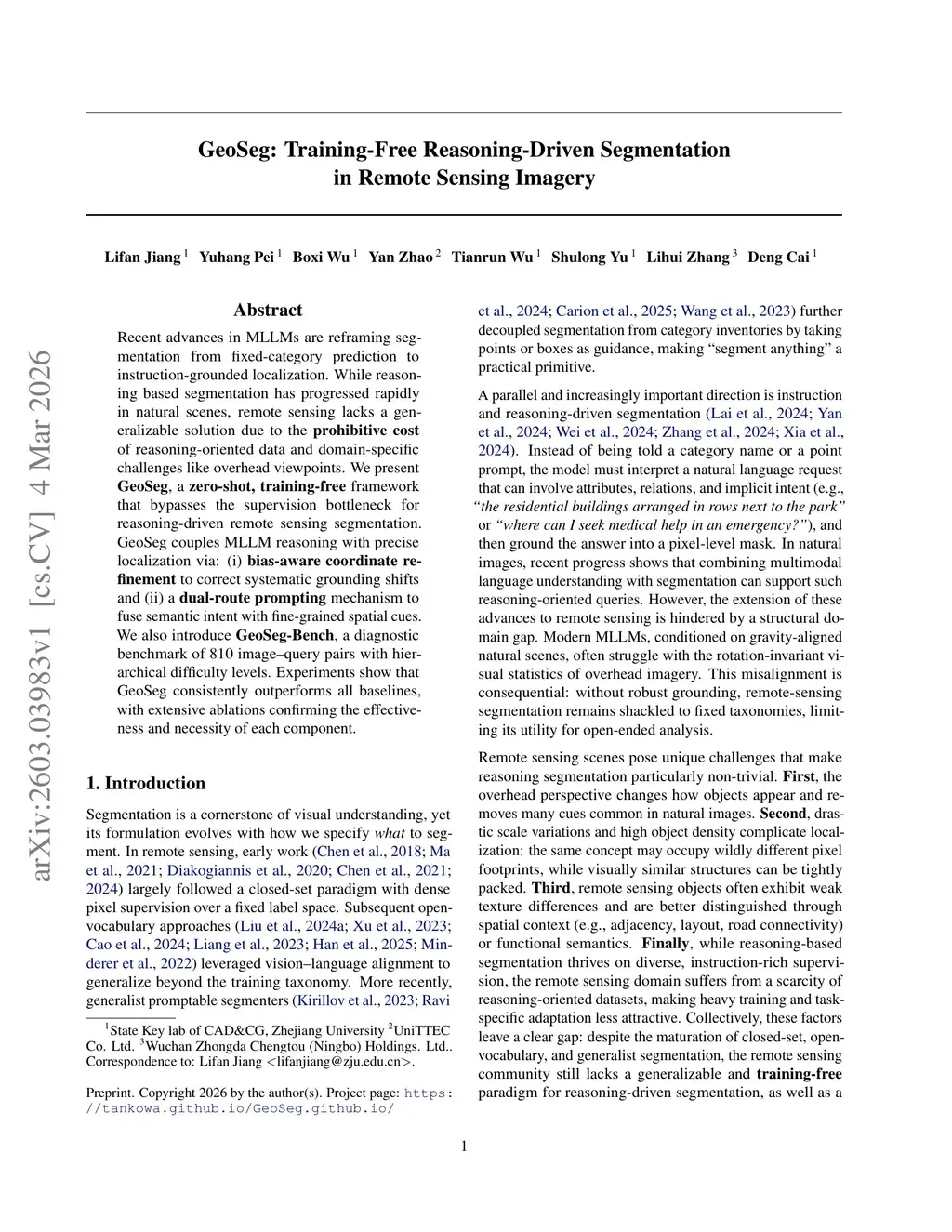 Recent advances in MLLMs are reframing segmentation from fixed-category prediction to instruction-grounded localization. While reasoning based segmentation has progressed rapidly in natural scenes, remote sensing lacks a generalizable solution due to the prohibitive cost of reasoning-oriented data and domain-specific challenges like overhead viewpoints. We present GeoSeg, a zero-shot, training-free framework that bypasses the supervision bottleneck for reasoning-driven remote sensing segmentation. GeoSeg couples MLLM reasoning with precise localization via: (i) bias-aware coordinate refinement to correct systematic grounding shifts and (ii) a dual-route prompting mechanism to fuse semantic intent with fine-grained spatial cues. We also introduce GeoSeg-Bench, a diagnostic benchmark of 810 image--query pairs with hierarchical difficulty levels. Experiments show that GeoSeg consistently outperforms all baselines, with extensive ablations confirming the effectiveness and necessity of each component.