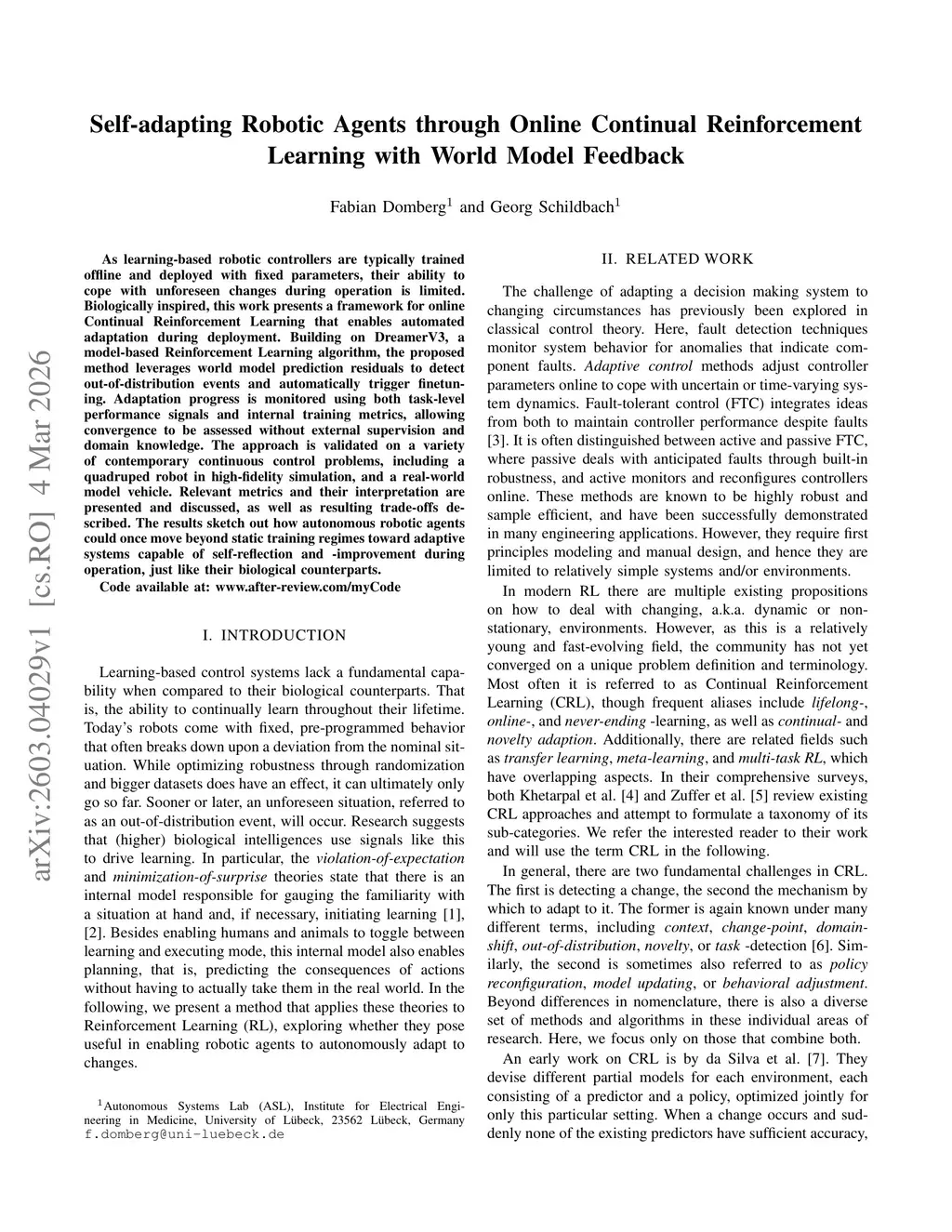 As learning-based robotic controllers are typically trained offline and deployed with fixed parameters, their ability to cope with unforeseen changes during operation is limited. Biologically inspired, this work presents a framework for online Continual Reinforcement Learning that enables automated adaptation during deployment. Building on DreamerV3, a model-based Reinforcement Learning algorithm, the proposed method leverages world model prediction residuals to detect out-of-distribution events and automatically trigger finetuning. Adaptation progress is monitored using both task-level performance signals and internal training metrics, allowing convergence to be assessed without external supervision and domain knowledge. The approach is validated on a variety of contemporary continuous control problems, including a quadruped robot in high-fidelity simulation, and a real-world model vehicle. Relevant metrics and their interpretation are presented and discussed, as well as resulting trade-offs described. The results sketch out how autonomous robotic agents could once move beyond static training regimes toward adaptive systems capable of self-reflection and -improvement during operation, just like their biological counterparts.