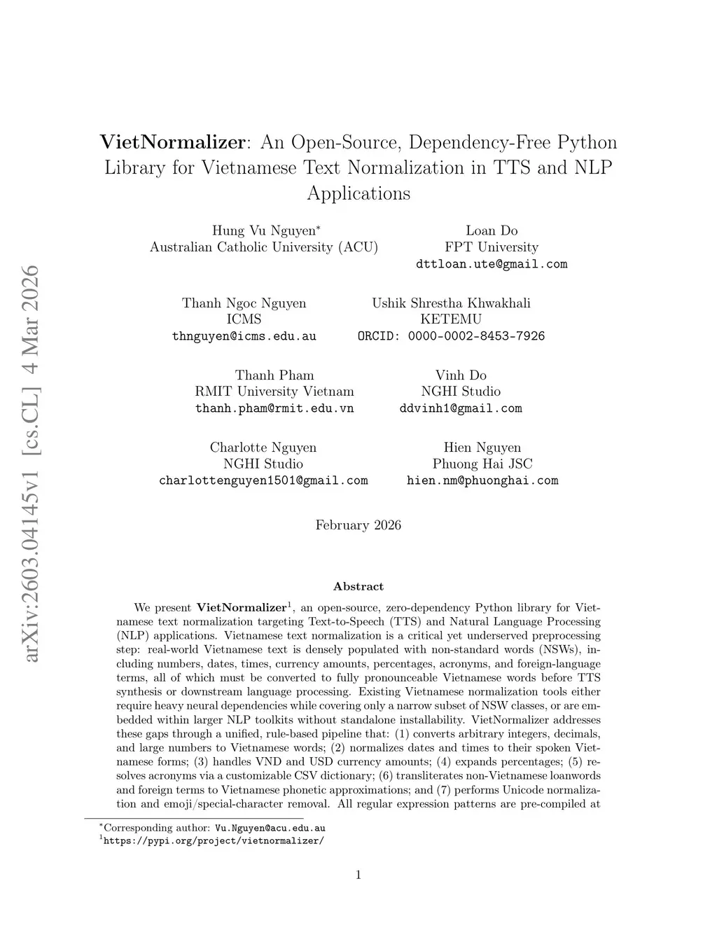 We present VietNormalizer1, an open-source, zero-dependency Python library for Vietnamese text normalization targeting Text-to-Speech (TTS) and Natural Language Processing (NLP) applications. Vietnamese text normalization is a critical yet underserved preprocessing step: real-world Vietnamese text is densely populated with non-standard words (NSWs), including numbers, dates, times, currency amounts, percentages, acronyms, and foreign-language terms, all of which must be converted to fully pronounceable Vietnamese words before TTS synthesis or downstream language processing. Existing Vietnamese normalization tools either require heavy neural dependencies while covering only a narrow subset of NSW classes, or are embedded within larger NLP toolkits without standalone installability. VietNormalizer addresses these gaps through a unified, rule-based pipeline that: (1) converts arbitrary integers, decimals, and large numbers to Vietnamese words; (2) normalizes dates and times to their spoken Vietnamese forms; (3) handles VND and USD currency amounts; (4) expands percentages; (5) resolves acronyms via a customizable CSV dictionary; (6) transliterates non-Vietnamese loanwords and foreign terms to Vietnamese phonetic approximations; and (7) performs Unicode normalization and emoji/special-character removal. All regular expression patterns are pre-compiled at initialization, enabling high-throughput batch processing with minimal memory overhead and no GPU or external API dependency. The library is installable via pip install vietnormalizer, available on PyPI and GitHub atthis https URL, and released under the MIT license. We discuss the design decisions, limitations of existing approaches, and the generalizability of the rule-based normalization paradigm to other low-resource tonal and agglutinative languages.