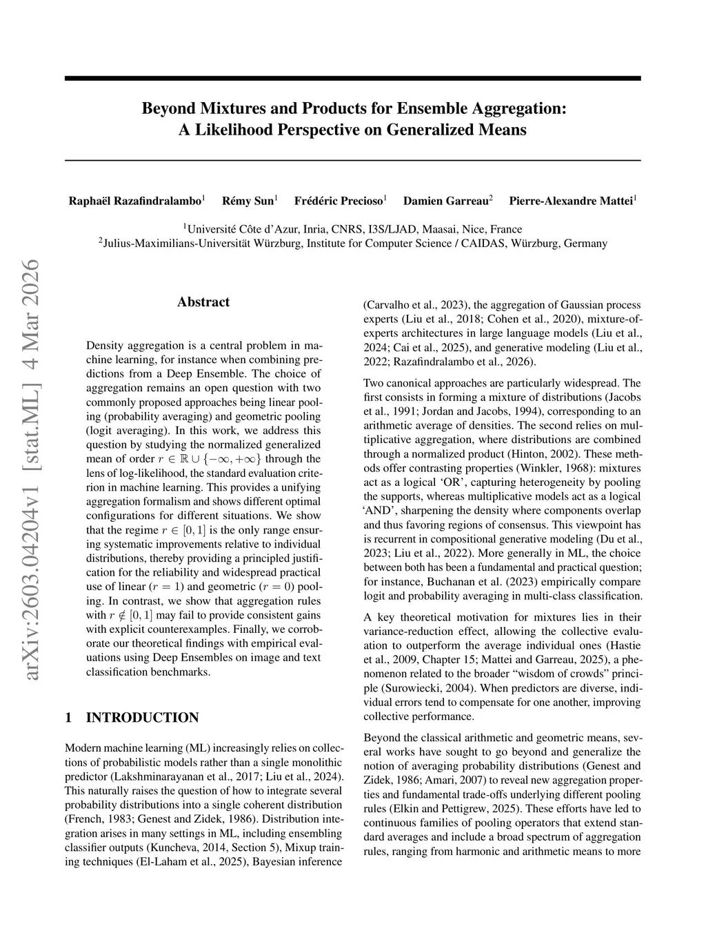 Density aggregation is a central problem in machine learning, for instance when combining predictions from a Deep Ensemble. The choice of aggregation remains an open question with two commonly proposed approaches being linear pooling (probability averaging) and geometric pooling (logit averaging). In this work, we address this question by studying the normalized generalized mean of order through the lens of log-likelihood, the standard evaluation criterion in machine learning. This provides a unifying aggregation formalism and shows different optimal configurations for different situations. We show that the regime is the only range ensuring systematic improvements relative to individual distributions, thereby providing a principled justification for the reliability and widespread practical use of linear () and geometric () pooling. In contrast, we show that aggregation rules with may fail to provide consistent gains with explicit counterexamples. Finally, we corroborate our theoretical findings with empirical evaluations using Deep Ensembles on image and text classification benchmarks.