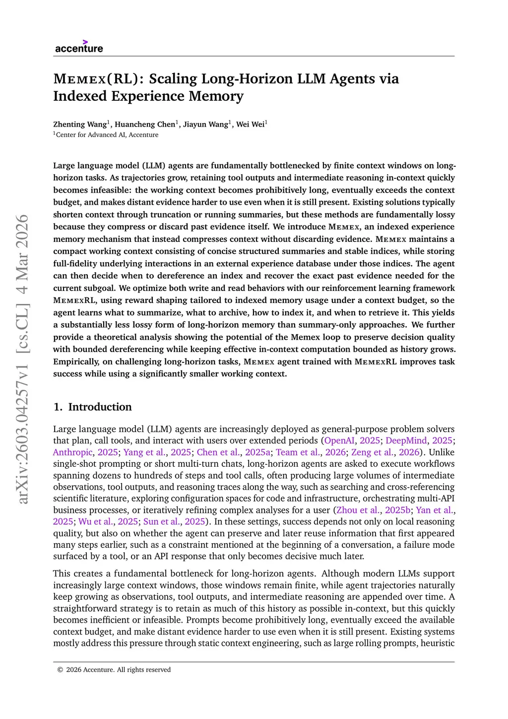 Large language model (LLM) agents are fundamentally bottlenecked by finite context windows on long-horizon tasks. As trajectories grow, retaining tool outputs and intermediate reasoning in-context quickly becomes infeasible: the working context becomes prohibitively long, eventually exceeds the context budget, and makes distant evidence harder to use even when it is still present. Existing solutions typically shorten context through truncation or running summaries, but these methods are fundamentally lossy because they compress or discard past evidence itself. We introduce Memex, an indexed experience memory mechanism that instead compresses context without discarding evidence. Memex maintains a compact working context consisting of concise structured summaries and stable indices, while storing full-fidelity underlying interactions in an external experience database under those indices. The agent can then decide when to dereference an index and recover the exact past evidence needed for the current subgoal. We optimize both write and read behaviors with our reinforcement learning framework MemexRL, using reward shaping tailored to indexed memory usage under a context budget, so the agent learns what to summarize, what to archive, how to index it, and when to retrieve it. This yields a substantially less lossy form of long-horizon memory than summary-only approaches. We further provide a theoretical analysis showing the potential of the Memex loop to preserve decision quality with bounded dereferencing while keeping effective in-context computation bounded as history grows. Empirically, on challenging long-horizon tasks, Memex agent trained with MemexRL improves task success while using a significantly smaller working context.