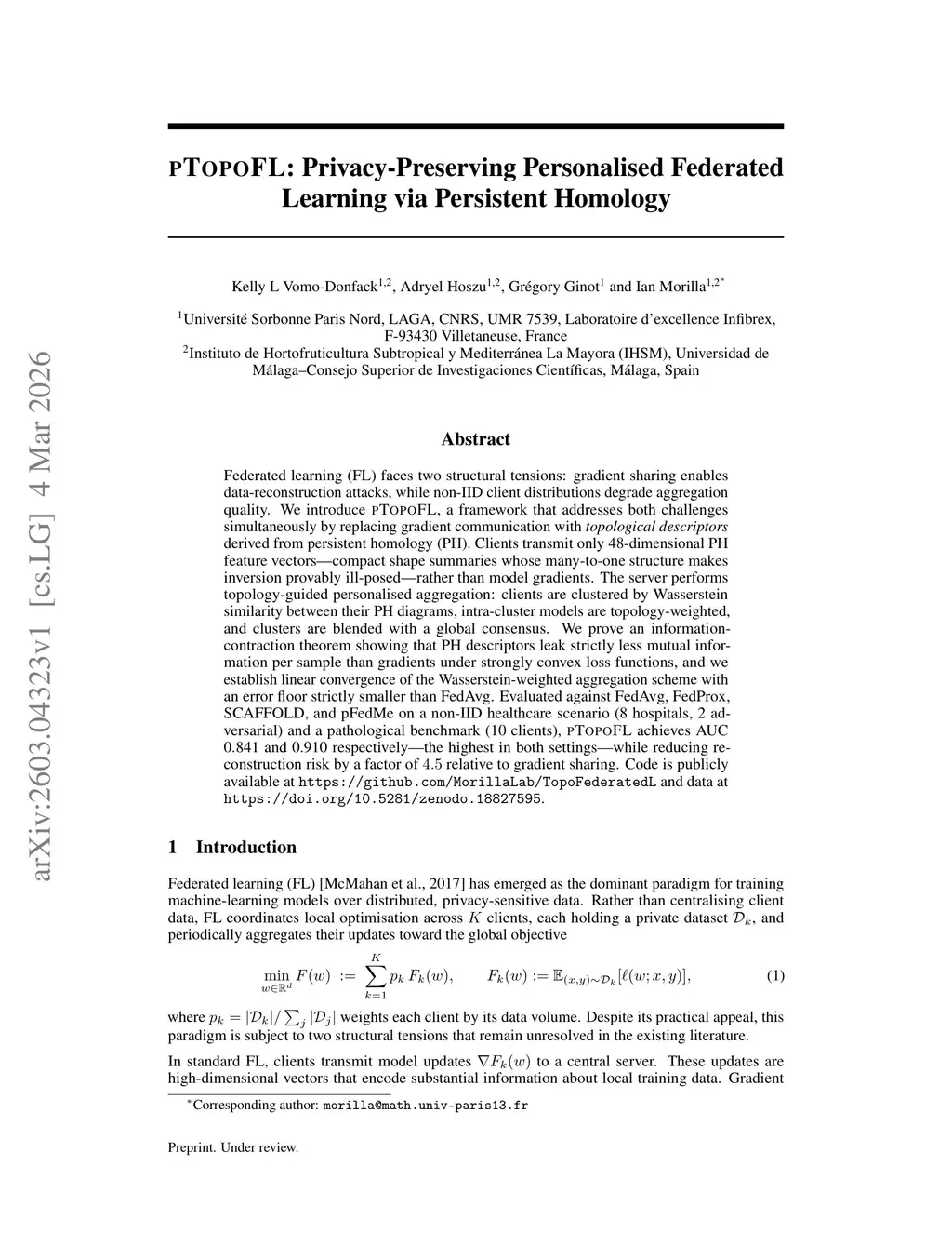 Federated learning (FL) faces two structural tensions: gradient sharing enables data-reconstruction attacks, while non-IID client distributions degrade aggregation quality. We introduce PTOPOFL, a framework that addresses both challenges simultaneously by replacing gradient communication with topological descriptors derived from persistent homology (PH). Clients transmit only 48-dimensional PH feature vectors-compact shape summaries whose many-to-one structure makes inversion provably ill-posed-rather than model gradients. The server performs topology-guided personalised aggregation: clients are clustered by Wasserstein similarity between their PH diagrams, intra-cluster models are topology-weighted,and clusters are blended with a global consensus. We prove an information-contraction theorem showing that PH descriptors leak strictly less mutual information per sample than gradients under strongly convex loss functions, and we establish linear convergence of the Wasserstein-weighted aggregation scheme with an error floor strictly smaller than FedAvg. Evaluated against FedAvg, FedProx, SCAFFOLD, and pFedMe on a non-IID healthcare scenario (8 hospitals, 2 adversarial) and a pathological benchmark (10 clients), PTOPOFL achieves AUC 0.841 and 0.910 respectively-the highest in both settings-while reducing reconstruction risk by a factor of 4.5 relative to gradient sharing. Code is publicly available atthis https URLand data atthis https URL.