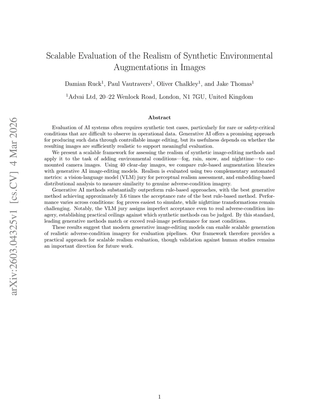 Evaluation of AI systems often requires synthetic test cases, particularly for rare or safety-critical conditions that are difficult to observe in operational data. Generative AI offers a promising approach for producing such data through controllable image editing, but its usefulness depends on whether the resulting images are sufficiently realistic to support meaningful evaluation.We present a scalable framework for assessing the realism of synthetic image-editing methods and apply it to the task of adding environmental conditions-fog, rain, snow, and nighttime-to car-mounted camera images. Using 40 clear-day images, we compare rule-based augmentation libraries with generative AI image-editing models. Realism is evaluated using two complementary automated metrics: a vision-language model (VLM) jury for perceptual realism assessment, and embedding-based distributional analysis to measure similarity to genuine adverse-condition imagery.Generative AI methods substantially outperform rule-based approaches, with the best generative method achieving approximately 3.6 times the acceptance rate of the best rule-based method. Performance varies across conditions: fog proves easiest to simulate, while nighttime transformations remain challenging. Notably, the VLM jury assigns imperfect acceptance even to real adverse-condition imagery, establishing practical ceilings against which synthetic methods can be judged. By this standard, leading generative methods match or exceed real-image performance for most conditions.These results suggest that modern generative image-editing models can enable scalable generation of realistic adverse-condition imagery for evaluation pipelines. Our framework therefore provides a practical approach for scalable realism evaluation, though validation against human studies remains an important direction for future work.