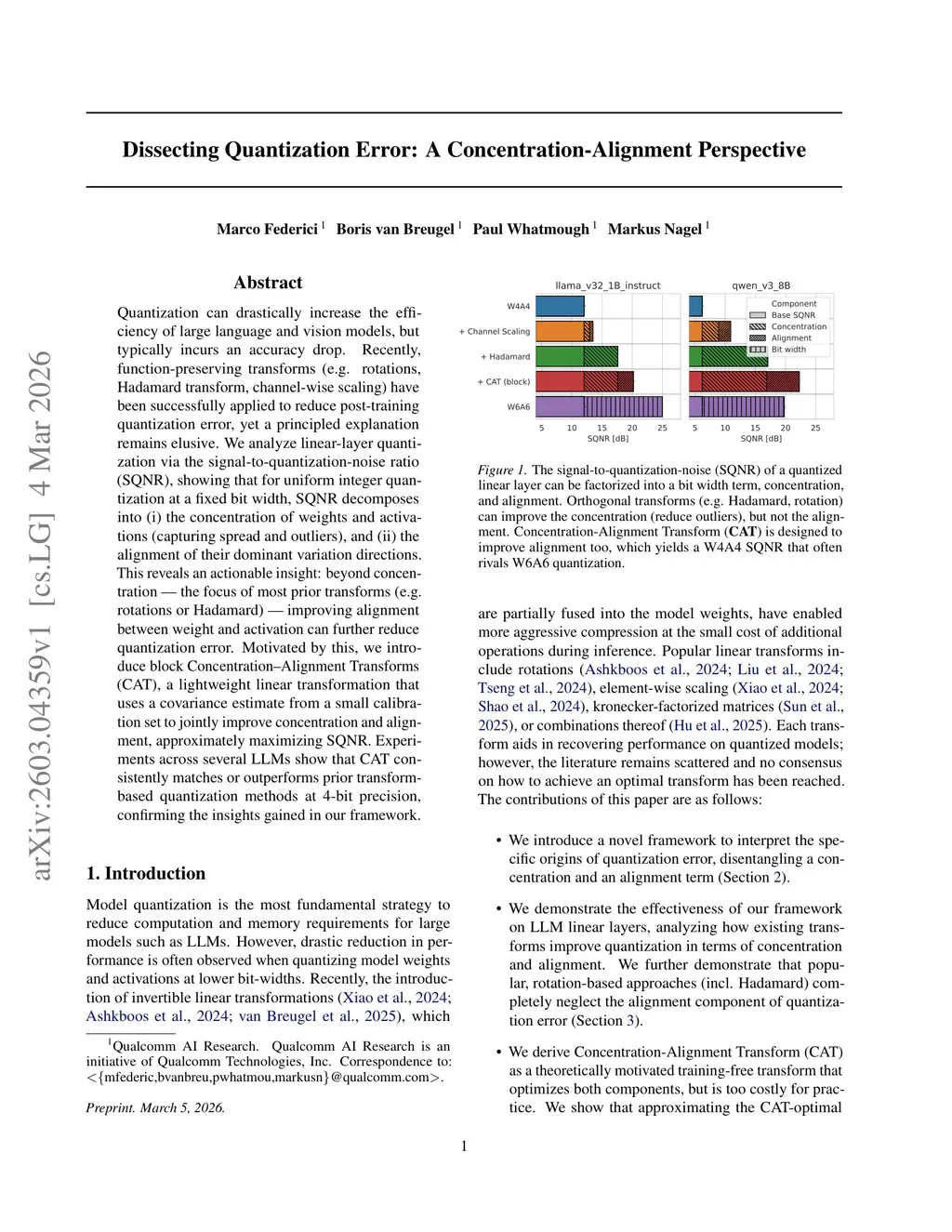 Quantization can drastically increase the efficiency of large language and vision models, but typically incurs an accuracy drop. Recently, function-preserving transforms (e.g. rotations, Hadamard transform, channel-wise scaling) have been successfully applied to reduce post-training quantization error, yet a principled explanation remains elusive. We analyze linear-layer quantization via the signal-to-quantization-noise ratio (SQNR), showing that for uniform integer quantization at a fixed bit width, SQNR decomposes into (i) the concentration of weights and activations (capturing spread and outliers), and (ii) the alignment of their dominant variation directions. This reveals an actionable insight: beyond concentration - the focus of most prior transforms (e.g. rotations or Hadamard) - improving alignment between weight and activation can further reduce quantization error. Motivated by this, we introduce block Concentration-Alignment Transforms (CAT), a lightweight linear transformation that uses a covariance estimate from a small calibration set to jointly improve concentration and alignment, approximately maximizing SQNR. Experiments across several LLMs show that CAT consistently matches or outperforms prior transform-based quantization methods at 4-bit precision, confirming the insights gained in our framework.