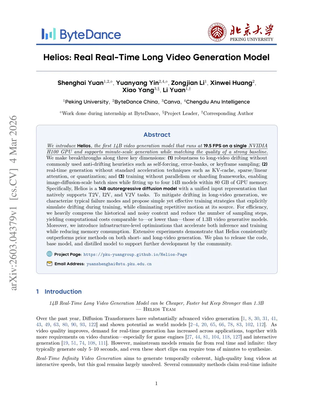 We introduce Helios, the first 14B video generation model that runs at 19.5 FPS on a single NVIDIA H100 GPU and supports minute-scale generation while matching the quality of a strong baseline. We make breakthroughs along three key dimensions: (1) robustness to long-video drifting without commonly used anti-drifting heuristics such as self-forcing, error-banks, or keyframe sampling; (2) real-time generation without standard acceleration techniques such as KV-cache, sparse/linear attention, or quantization; and (3) training without parallelism or sharding frameworks, enabling image-diffusion-scale batch sizes while fitting up to four 14B models within 80 GB of GPU memory. Specifically, Helios is a 14B autoregressive diffusion model with a unified input representation that natively supports T2V, I2V, and V2V tasks. To mitigate drifting in long-video generation, we characterize typical failure modes and propose simple yet effective training strategies that explicitly simulate drifting during training, while eliminating repetitive motion at its source. For efficiency, we heavily compress the historical and noisy context and reduce the number of sampling steps, yielding computational costs comparable to -- or lower than -- those of 1.3B video generative models. Moreover, we introduce infrastructure-level optimizations that accelerate both inference and training while reducing memory consumption. Extensive experiments demonstrate that Helios consistently outperforms prior methods on both short- and long-video generation. We plan to release the code, base model, and distilled model to support further development by the community.