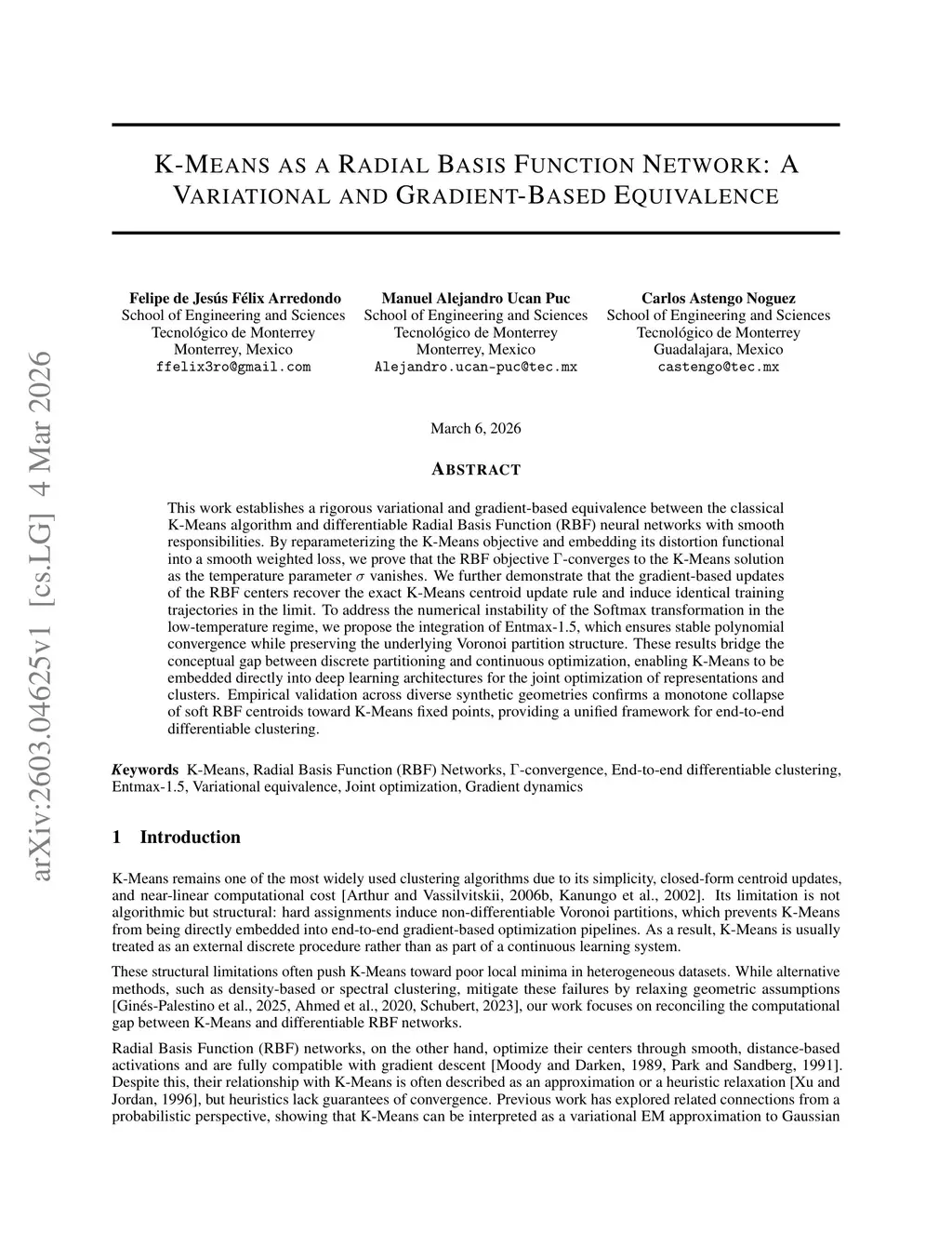 This work establishes a rigorous variational and gradient-based equivalence between the classical K-Means algorithm and differentiable Radial Basis Function (RBF) neural networks with smooth responsibilities. By reparameterizing the K-Means objective and embedding its distortion functional into a smooth weighted loss, we prove that the RBF objective -converges to the K-Means solution as the temperature parameter vanishes. We further demonstrate that the gradient-based updates of the RBF centers recover the exact K-Means centroid update rule and induce identical training trajectories in the limit. To address the numerical instability of the Softmax transformation in the low-temperature regime, we propose the integration of Entmax-1.5, which ensures stable polynomial convergence while preserving the underlying Voronoi partition structure. These results bridge the conceptual gap between discrete partitioning and continuous optimization, enabling K-Means to be embedded directly into deep learning architectures for the joint optimization of representations and clusters. Empirical validation across diverse synthetic geometries confirms a monotone collapse of soft RBF centroids toward K-Means fixed points, providing a unified framework for end-to-end differentiable clustering.
