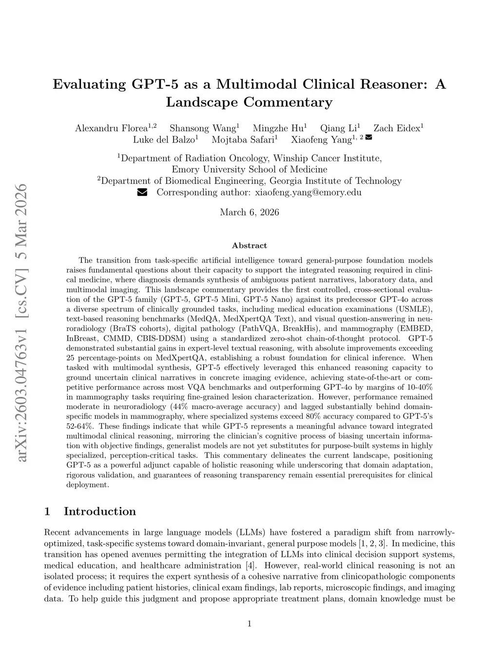 The transition from task-specific artificial intelligence toward general-purpose foundation models raises fundamental questions about their capacity to support the integrated reasoning required in clinical medicine, where diagnosis demands synthesis of ambiguous patient narratives, laboratory data, and multimodal imaging. This landscape commentary provides the first controlled, cross-sectional evaluation of the GPT-5 family (GPT-5, GPT-5 Mini, GPT-5 Nano) against its predecessor GPT-4o across a diverse spectrum of clinically grounded tasks, including medical education examinations, text-based reasoning benchmarks, and visual question-answering in neuroradiology, digital pathology, and mammography using a standardized zero-shot chain-of-thought protocol. GPT-5 demonstrated substantial gains in expert-level textual reasoning, with absolute improvements exceeding 25 percentage-points on MedXpertQA. When tasked with multimodal synthesis, GPT-5 effectively leveraged this enhanced reasoning capacity to ground uncertain clinical narratives in concrete imaging evidence, achieving state-of-the-art or competitive performance across most VQA benchmarks and outperforming GPT-4o by margins of 10-40% in mammography tasks requiring fine-grained lesion characterization. However, performance remained moderate in neuroradiology (44% macro-average accuracy) and lagged behind domain-specific models in mammography, where specialized systems exceed 80% accuracy compared to GPT-5's 52-64%. These findings indicate that while GPT-5 represents a meaningful advance toward integrated multimodal clinical reasoning, mirroring the clinician's cognitive process of biasing uncertain information with objective findings, generalist models are not yet substitutes for purpose-built systems in highly specialized, perception-critical tasks.