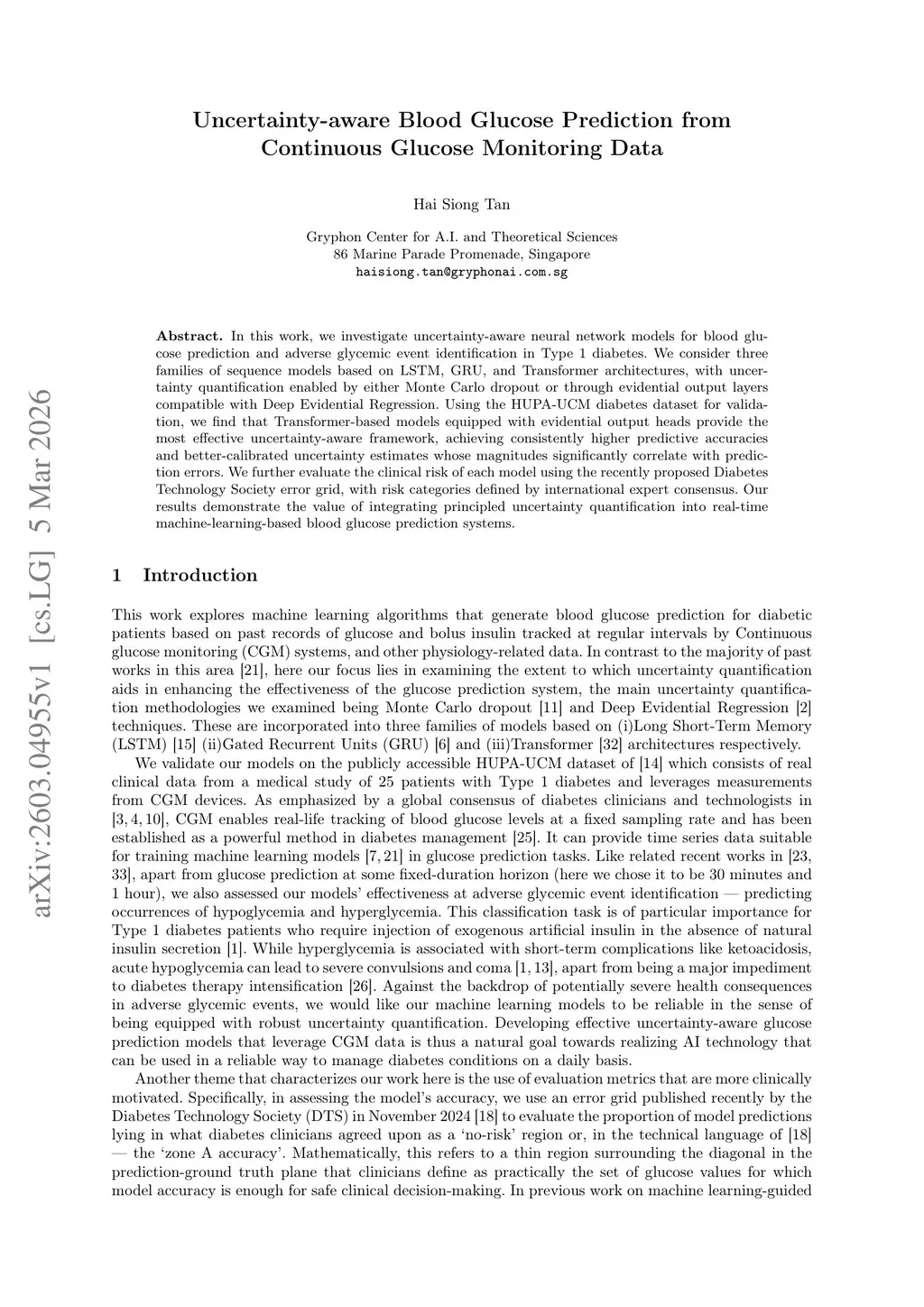 In this work, we investigate uncertainty-aware neural network models for blood glucose prediction and adverse glycemic event identification in Type 1 diabetes. We consider three families of sequence models based on LSTM, GRU, and Transformer architectures, with uncertainty quantification enabled by either Monte Carlo dropout or through evidential output layers compatible with Deep Evidential Regression. Using the HUPA-UCM diabetes dataset for validation, we find that Transformer-based models equipped with evidential output heads provide the most effective uncertainty-aware framework, achieving consistently higher predictive accuracies and better-calibrated uncertainty estimates whose magnitudes significantly correlate with prediction errors. We further evaluate the clinical risk of each model using the recently proposed Diabetes Technology Society error grid, with risk categories defined by international expert consensus. Our results demonstrate the value of integrating principled uncertainty quantification into real-time machine-learning-based blood glucose prediction systems.