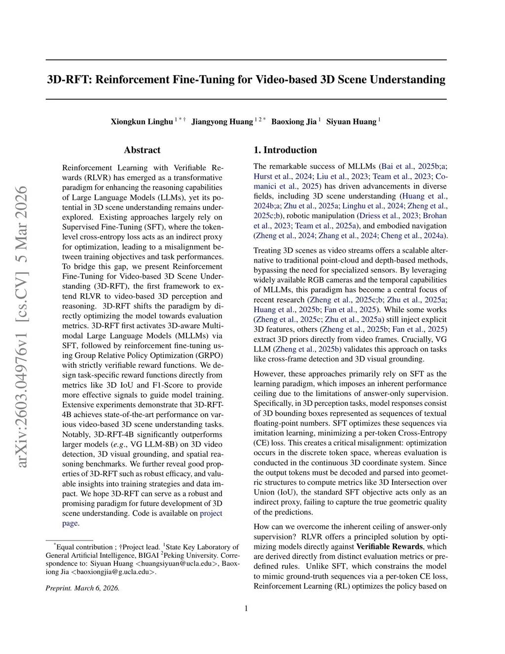 Reinforcement Learning with Verifiable Rewards ( RLVR ) has emerged as a transformative paradigm for enhancing the reasoning capabilities of Large Language Models ( LLMs), yet its potential in 3D scene understanding remains under-explored. Existing approaches largely rely on Supervised Fine-Tuning ( SFT), where the token-level cross-entropy loss acts as an indirect proxy for optimization, leading to a misalignment between training objectives and task performances. To bridge this gap, we present Reinforcement Fine-Tuning for Video-based 3D Scene Understanding (3D-RFT ), the first framework to extend RLVR to video-based 3D perception and reasoning. 3D-RFT shifts the paradigm by directly optimizing the model towards evaluation metrics. 3D-RFT first activates 3D-aware Multi-modal Large Language Models ( MLLM s) via SFT, followed by reinforcement fine-tuning using Group Relative Policy Optimization ( GRPO) with strictly verifiable reward functions. We design task-specific reward functions directly from metrics like 3D IoU and F1-Score to provide more effective signals to guide model training. Extensive experiments demonstrate that 3D-RFT-4B achieves state-of-the-art performance on various video-based 3D scene understanding tasks. Notably, 3D-RFT-4B significantly outperforms larger models (e.g., VG LLM-8B) on 3D video detection, 3D visual grounding, and spatial reasoning benchmarks. We further reveal good properties of 3D-RFT such as robust efficacy, and valuable insights into training strategies and data impact. We hope 3D-RFT can serve as a robust and promising paradigm for future development of 3D scene understanding.