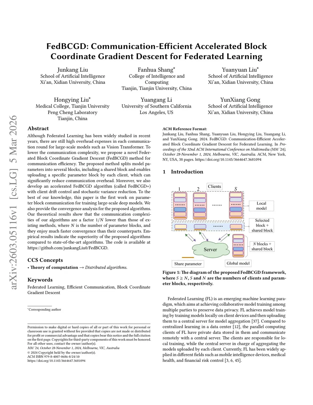 Although Federated Learning has been widely studied in recent years, there are still high overhead expenses in each communication round for large-scale models such as Vision Transformer. To lower the communication complexity, we propose a novel Federated Block Coordinate Gradient Descent (FedBCGD) method for communication efficiency. The proposed method splits model parameters into several blocks, including a shared block and enables uploading a specific parameter block by each client, which can significantly reduce communication overhead. Moreover, we also develop an accelerated FedBCGD algorithm (called FedBCGD+) with client drift control and stochastic variance reduction. To the best of our knowledge, this paper is the first work on parameter block communication for training large-scale deep models. We also provide the convergence analysis for the proposed algorithms. Our theoretical results show that the communication complexities of our algorithms are a factor lower than those of existing methods, where is the number of parameter blocks, and they enjoy much faster convergence than their counterparts. Empirical results indicate the superiority of the proposed algorithms compared to state-of-the-art algorithms.The code is available atthis https URL.