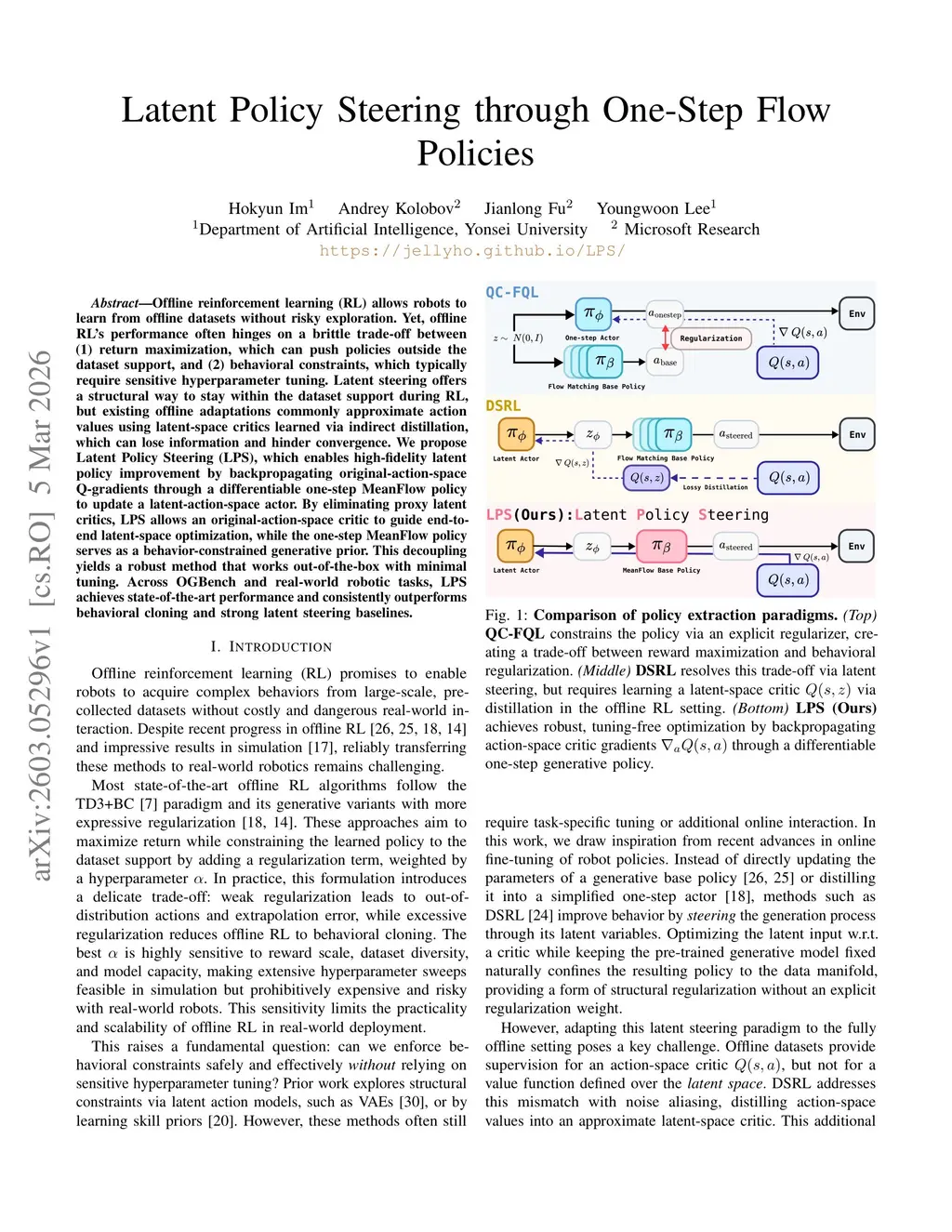 Offline reinforcement learning (RL) allows robots to learn from offline datasets without risky exploration. Yet, offline RL's performance often hinges on a brittle trade-off between (1) return maximization, which can push policies outside the dataset support, and (2) behavioral constraints, which typically require sensitive hyperparameter tuning. Latent steering offers a structural way to stay within the dataset support during RL, but existing offline adaptations commonly approximate action values using latent-space critics learned via indirect distillation, which can lose information and hinder convergence. We propose Latent Policy Steering (LPS), which enables high-fidelity latent policy improvement by backpropagating original-action-space Q-gradients through a differentiable one-step MeanFlow policy to update a latent-action-space actor. By eliminating proxy latent critics, LPS allows an original-action-space critic to guide end-to-end latent-space optimization, while the one-step MeanFlow policy serves as a behavior-constrained generative prior. This decoupling yields a robust method that works out-of-the-box with minimal tuning. Across OGBench and real-world robotic tasks, LPS achieves state-of-the-art performance and consistently outperforms behavioral cloning and strong latent steering baselines.