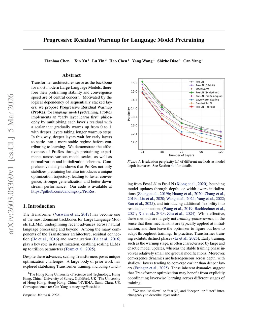 Transformer architectures serve as the backbone for most modern Large Language Models, therefore their pretraining stability and convergence speed are of central concern. Motivated by the logical dependency of sequentially stacked layers, we propose Progressive Residual Warmup (ProRes) for language model pretraining. ProRes implements an "early layer learns first" philosophy by multiplying each layer's residual with a scalar that gradually warms up from 0 to 1, with deeper layers taking longer warmup steps. In this way, deeper layers wait for early layers to settle into a more stable regime before contributing to learning. We demonstrate the effectiveness of ProRes through pretraining experiments across various model scales, as well as normalization and initialization schemes. Comprehensive analysis shows that ProRes not only stabilizes pretraining but also introduces a unique optimization trajectory, leading to faster convergence, stronger generalization and better downstream performance. Our code is available atthis https URL.
