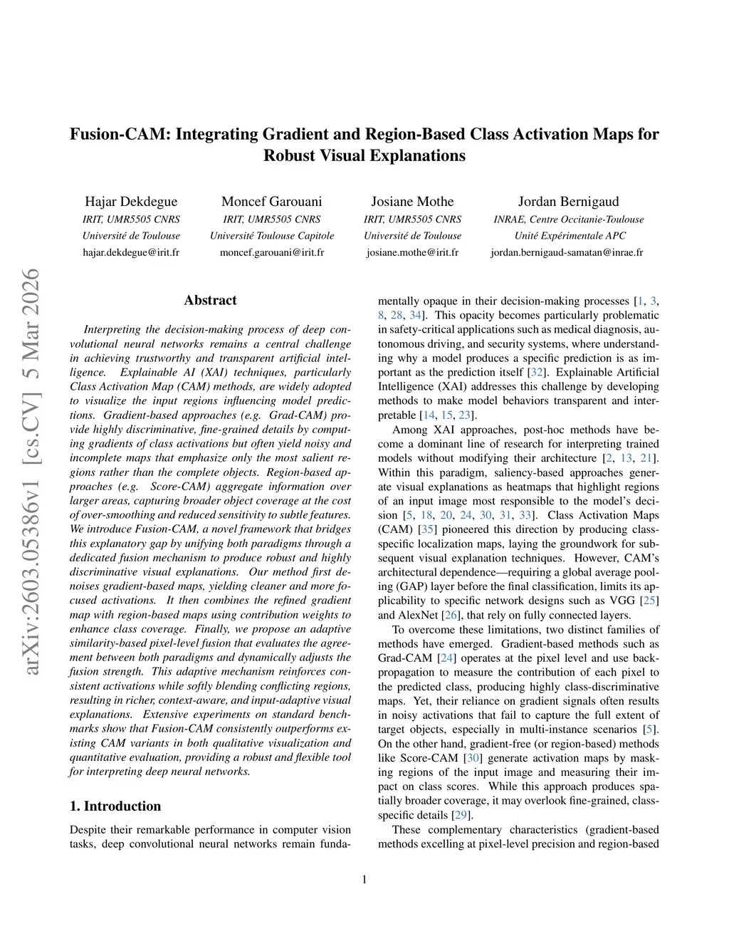 Interpreting the decision-making process of deep convolutional neural networks remains a central challenge in achieving trustworthy and transparent artificial intelligence. Explainable AI (XAI) techniques, particularly Class Activation Map (CAM) methods, are widely adopted to visualize the input regions influencing model predictions. Gradient-based approaches (e.g. Grad-CAM) provide highly discriminative, fine-grained details by computing gradients of class activations but often yield noisy and incomplete maps that emphasize only the most salient regions rather than the complete objects. Region-based approaches (e.g. Score-CAM) aggregate information over larger areas, capturing broader object coverage at the cost of over-smoothing and reduced sensitivity to subtle features. We introduce Fusion-CAM, a novel framework that bridges this explanatory gap by unifying both paradigms through a dedicated fusion mechanism to produce robust and highly discriminative visual explanations. Our method first denoises gradient-based maps, yielding cleaner and more focused activations. It then combines the refined gradient map with region-based maps using contribution weights to enhance class coverage. Finally, we propose an adaptive similarity-based pixel-level fusion that evaluates the agreement between both paradigms and dynamically adjusts the fusion strength. This adaptive mechanism reinforces consistent activations while softly blending conflicting regions, resulting in richer, context-aware, and input-adaptive visual explanations. Extensive experiments on standard benchmarks show that Fusion-CAM consistently outperforms existing CAM variants in both qualitative visualization and quantitative evaluation, providing a robust and flexible tool for interpreting deep neural networks.